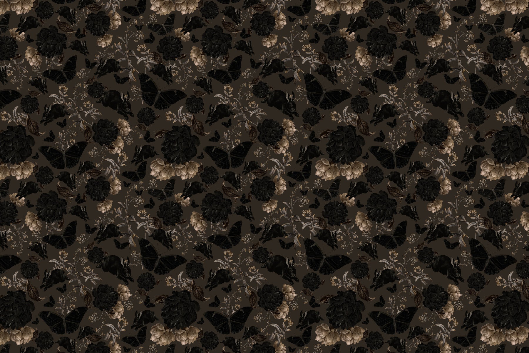 Moody floral and insect pattern on the Dark Academia Nocturnal Garden Wall Mural.