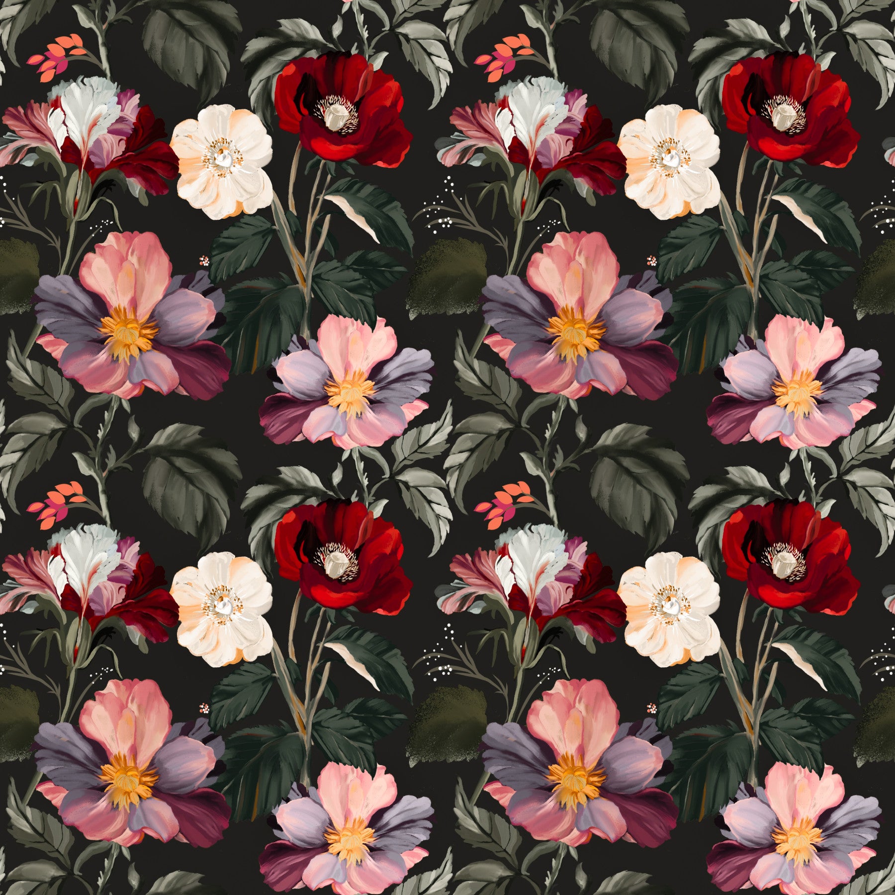 Create an enchanting space with this floral-themed wallpaper. Featuring full blooms, the design blends dark backgrounds with bright highlights of red, pink, and cream. Perfect wallpaper for walls in bedrooms, living rooms, or hallways, this wallpaper brings a bit of mystery to the room. The detailed floral design serves as a statement piece. You'll love the rich, unique ambiance it adds.