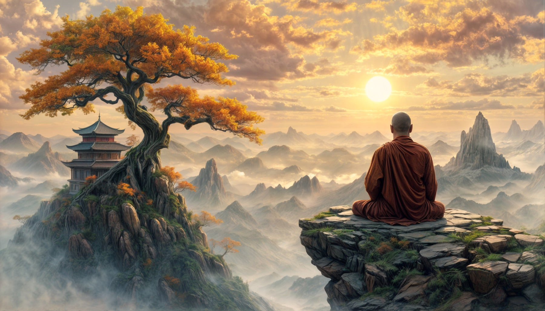Immerse yourself in a world of peace with the 'Dawn Serenity' wallpaper for walls. This design showcases a breathtaking landscape, capturing the moment when the first light of day kisses distant mountain peaks. A solitary figure sits in contemplation, offering a sense of stillness and mindfulness. The colors blend soft oranges, golds, and earthy browns with the misty blues and greens of the valleys. 'Dawn Serenity' enhances your space with a calming presence, perfectly suited for bedrooms, studies, or meditation areas. Invite tranquility into your home and transform your walls into a serene vista.