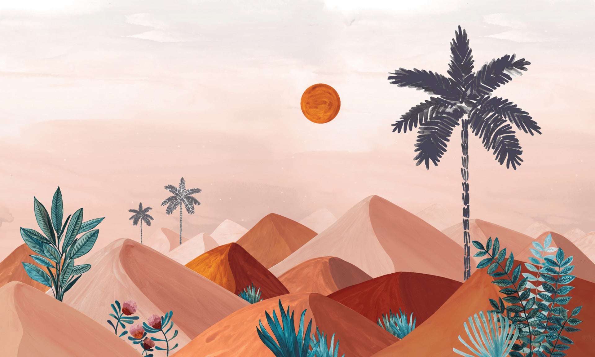 Drape your surroundings in a daytime mountain landscape mural's artistic embrace. This is a masterpiece in watercolour wallpaper with a serene journey in rosy mountain crests and feathery palms, all beneath a gentle copper sun. With each stroke, dreamy washes of colour whisper stories of peaceful afternoons. This mural is not a backdrop but an invitation to lose yourself in a painted paradise where the everyday fades into soft, pastel infinity. Adorning a wall with this piece infuses your area with a stroke of creative whimsy, turning the mundane into a canvas of nature's poetic vistas. This is where art meets life in a perpetual dance of colour and light.