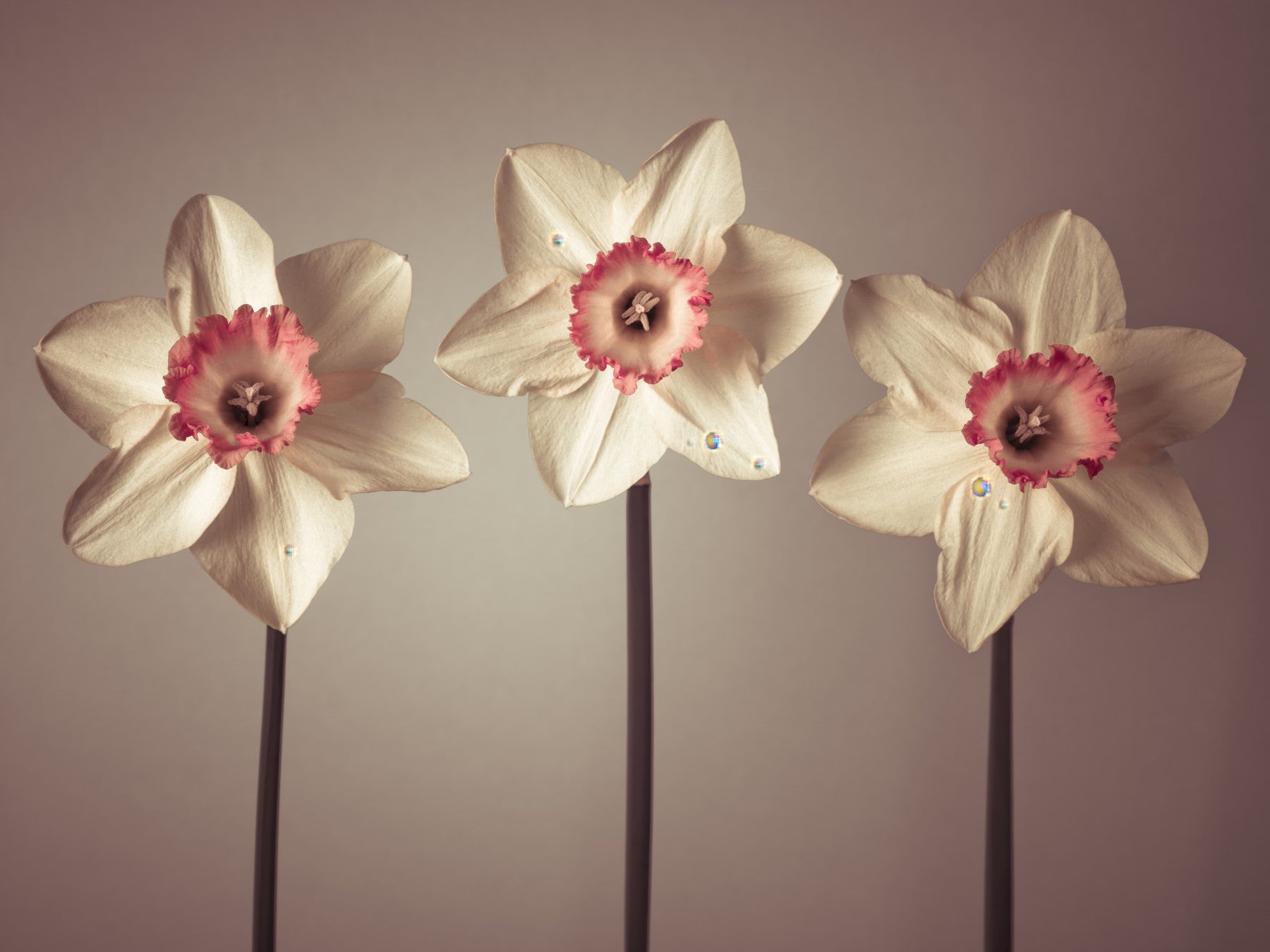 Three daffodils. Invite the subtle promise of spring into your home with 'Dazzling Daffodils'. This sophisticated floral design showcases the delicate beauty of three pristine daffodils, presented in exquisite detail. The creamy white petals, accentuated by a vibrant coral-pink crown, offer a refined elegance that will effortlessly elevate any space. Tiny droplets rest gently on the petals, reflecting light and adding a touch of whimsical charm. The neutral background provides a calming backdrop, allowing the daffodils to take center stage, creating a focal point that is both captivating and serene. Perfect for adding a touch of understated luxury and botanical beauty to your walls.