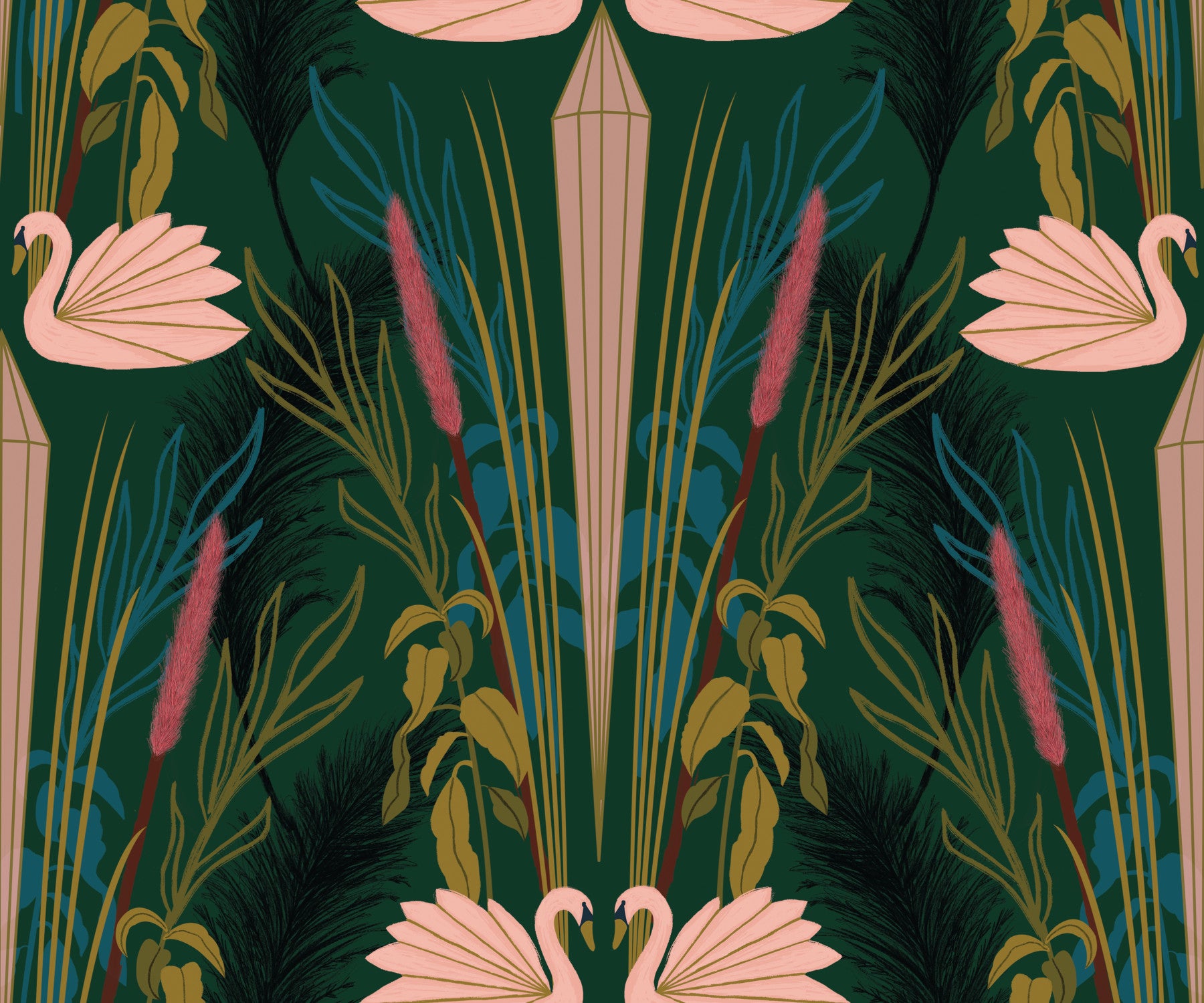 Embrace Art Deco elegance with this captivating wallpaper. Stylized pink swans take center stage against a rich, jewel-toned green backdrop. The design features a symmetrical arrangement, showcasing the swans amidst a lush landscape of stylized Art Deco foliage. Long, slender grasses and textured plants create a sense of depth and sophistication. Geometric elements subtly integrate into the natural forms, enhancing the overall refined and luxurious aesthetic, perfect for adding a touch of vintage glamour to any space.