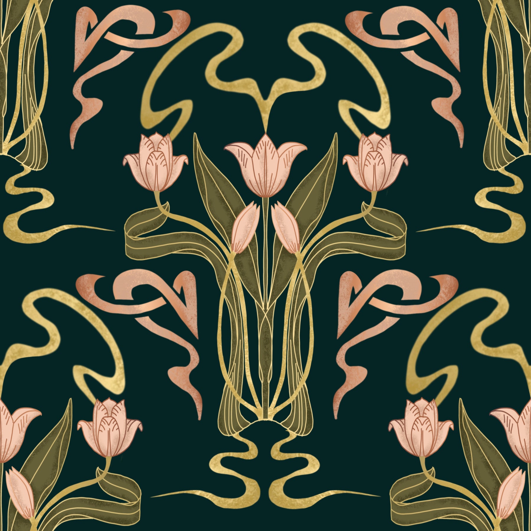 Immerse yourself in the opulent elegance of "Deco Tulip Bloom." This Art Deco and Art Nouveau-inspired wallpaper transports you to a deep forest, where blush pink tulips bloom amidst a rich, emerald green backdrop. Gold and rose-gold stylized lines intertwine, creating a luxurious and intricate pattern reminiscent of 1920s design. The seamless design features delicate floral details and graceful curves, offering a sophisticated and calming atmosphere perfect for any space. Experience the refined beauty of nature and geometric artistry combined in this stunning piece.