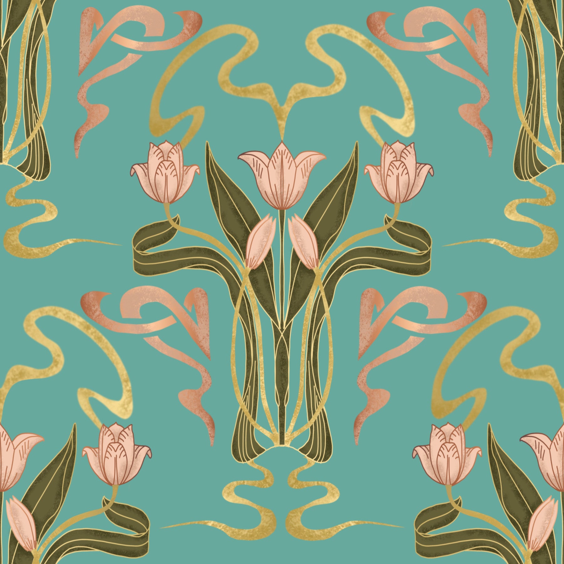 Indulge in the serene beauty of 'Deco Tulip Bloom,' a captivating wallpaper design blending the elegance of Art Deco with the organic grace of Art Nouveau. Soft blush pink tulips, rendered with exquisite detail, blossom amidst a tranquil aqua backdrop. Swirls of gold and rose gold metallic accents intertwine with the floral motifs, creating a luxurious and sophisticated feel. This wallpaper perfectly balances modern aesthetics with timeless charm, offering a calming yet visually stimulating experience for your digital space. The intricate details and harmonious color palette make it a perfect choice for those seeking a refined and elegant design.