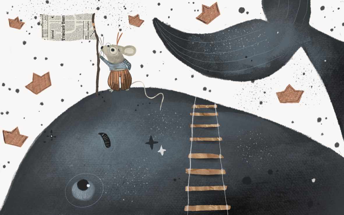 Unique mural art of a deep blue behemoth with rats in mischief.