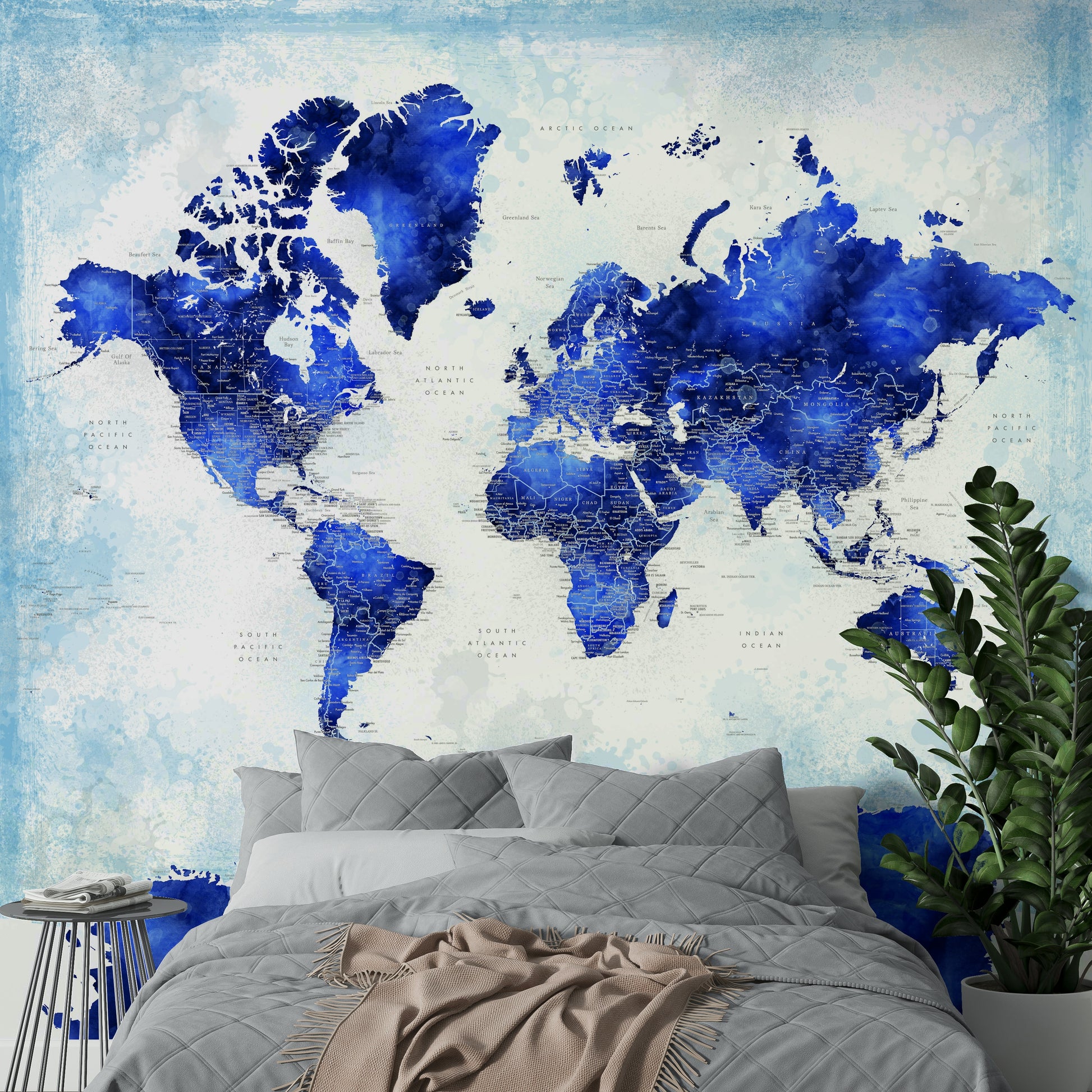 Make a bold statement with the Deep Blue Watercolor World Map Wallpaper, designed to inspire awe and wanderlust. Featuring rich, saturated shades of navy and royal blue with fluid watercolor textures, this mural adds depth and drama to any room. Every country and city is carefully labeled, making it as functional as it is striking. Ideal for modern offices, creative studios, living rooms, or travel-themed interiors, it brings sophistication and global flair to your walls. Available in peel-and-stick or traditional wallpaper options, it’s easy to install and eco-friendly. Elevate your space with this stunning map in timeless deep blue.