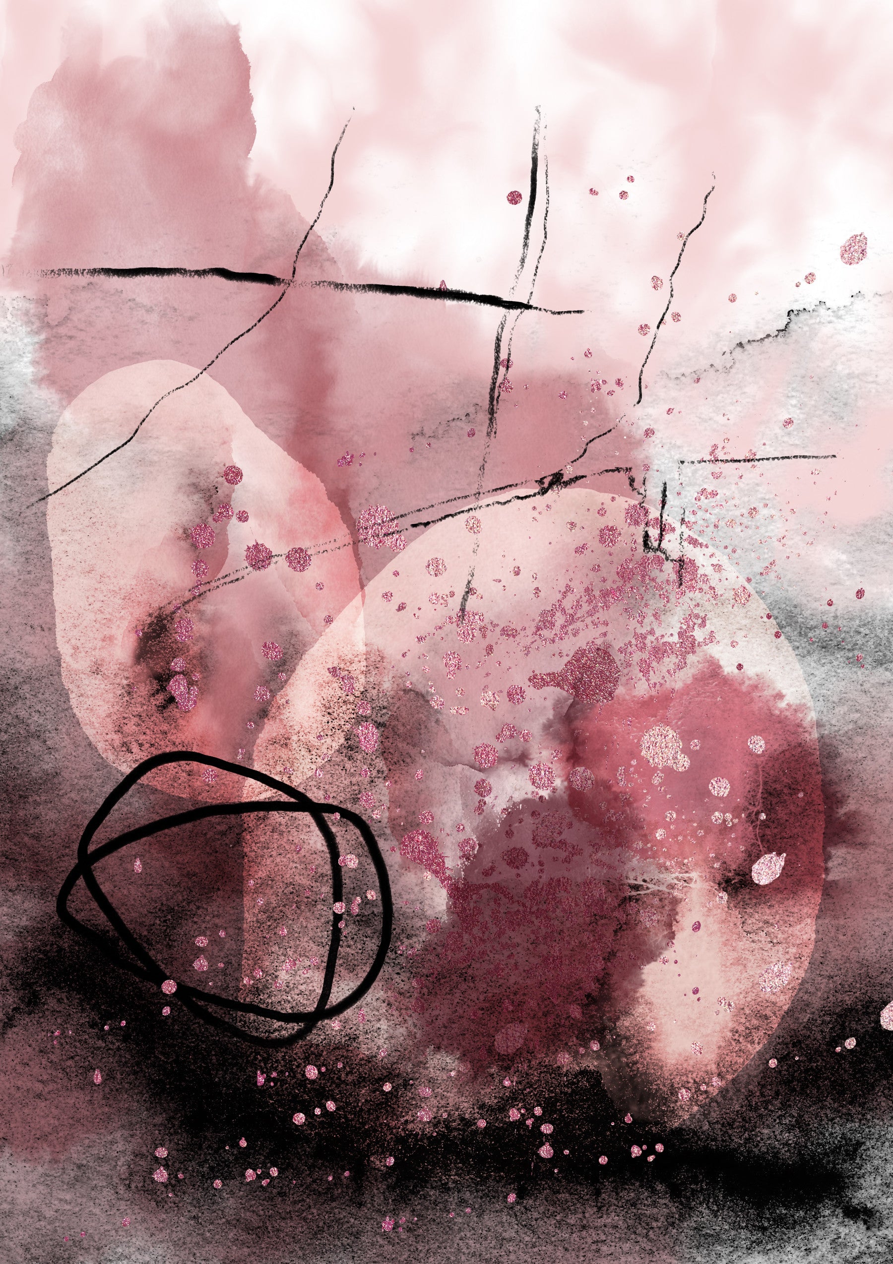 This wallpaper is a captivating blend of abstract watercolor art and minimalist design. Soft rose, blush pink, and dusky mauve hues dance across a canvas of charcoal and black, creating a dreamy and sophisticated atmosphere. Delicate rose gold glitter accents add a touch of luxury, while the organic shapes and flowing lines evoke a sense of tranquility and calm. Perfect for bedrooms, living rooms, or any space needing a touch of serene elegance. The interplay of light and dark, along with the subtle sparkle, adds depth and visual interest, making it a truly unique piece of art for your walls.