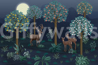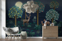 Create a captivating space with this Deer in Bloom wallpaper for walls. This enchanting scene shows a deer family amidst blossoming trees under a soft moonlight. A palette of deep blues, greens, and subtle pinks brings this nocturnal landscape to life. Perfect for bedrooms, nurseries, or reading corners, this wallpaper adds a touch of whimsical elegance to your home. Let this wall décor complement your furnishings, turning ordinary spaces into dreamy retreats. Immerse yourself in the serenity of nature with this artful and calming design.