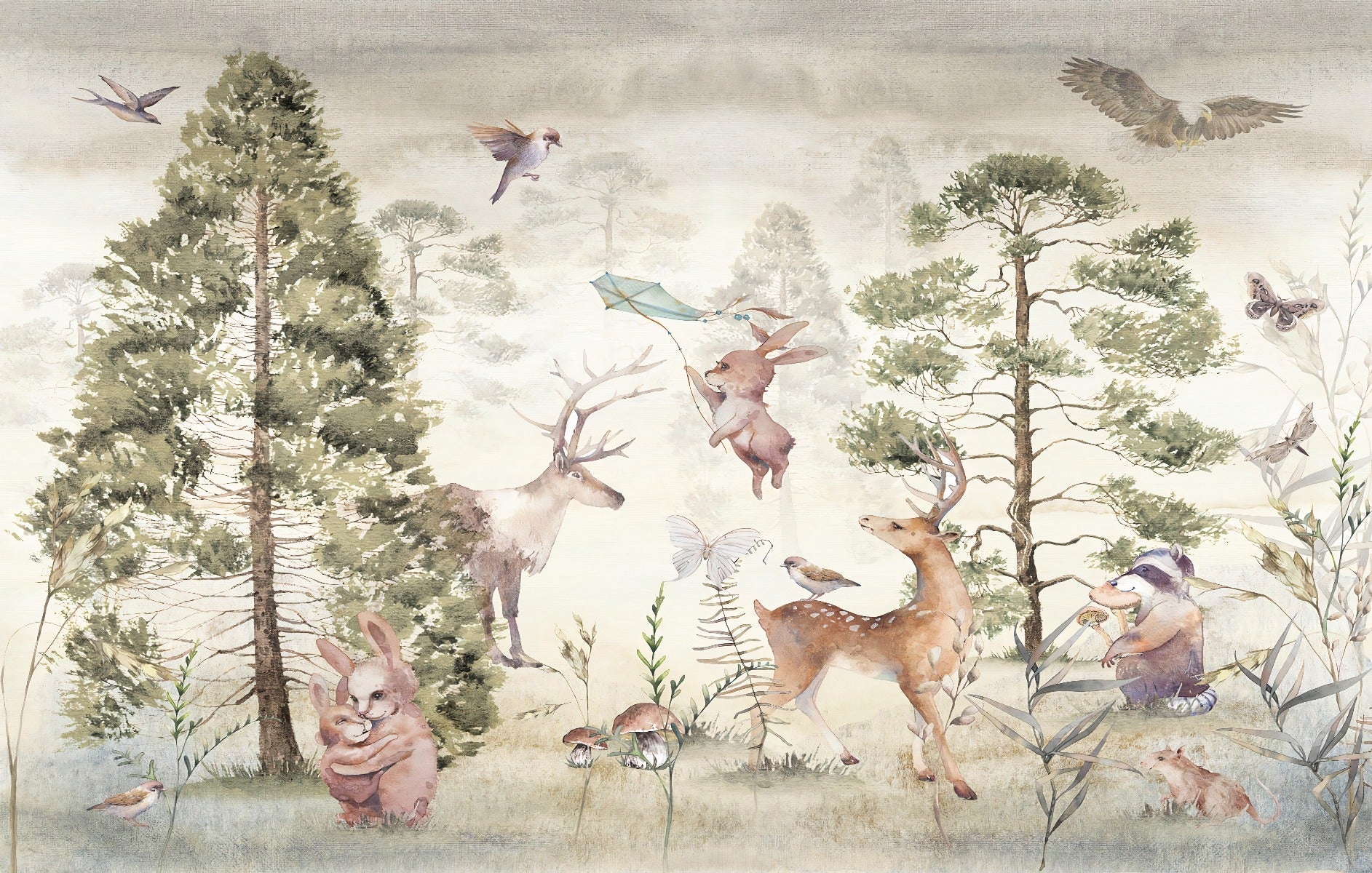 Bring the magic of nature into the home with the forest friends' kids room beige color wallpaper mural. Your children will have fun outings with their new woodland companions, from looking curious, lurking squirrel to the fun, giggling fox. This original and fun wall pattern turns every playroom into a peaceful forest kingdom. The quiet beige actually creates a calm and serene atmosphere that could be used to parent your child's bedroom. Allow your child to unlock the secrets of the forest with this magical wallpaper for kids that will undoubtedly stimulate their creativity.