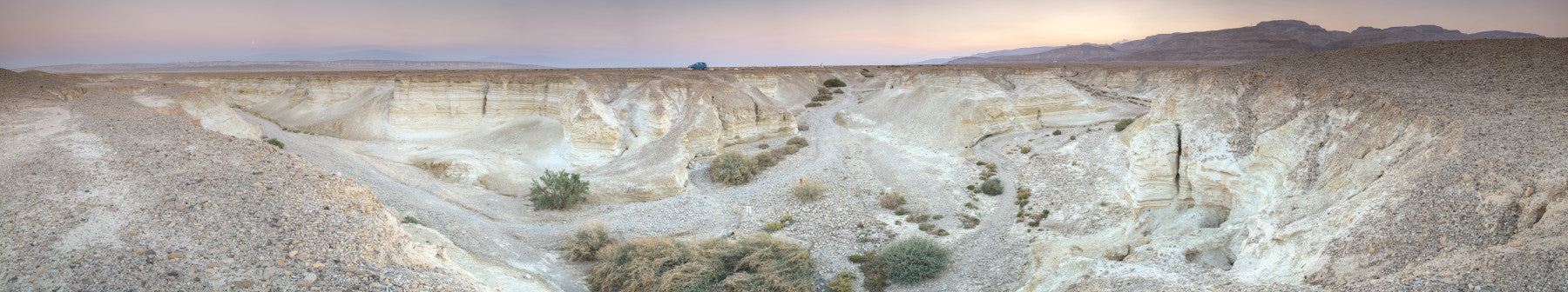 Nahal Prazim canyon in Negev Desert, Israel. Capture the tranquil beauty of a desert canyon at sunrise. This wallpaper for walls showcases the stark landscape with its layered rock formations and subtle earth tones. The panoramic view, featuring muted pinks and tans, brings a calming touch to any room. It is ideal for creating a serene atmosphere in living rooms, bedrooms, or home offices. The subtle color palette complements minimalist, rustic, or modern interiors.