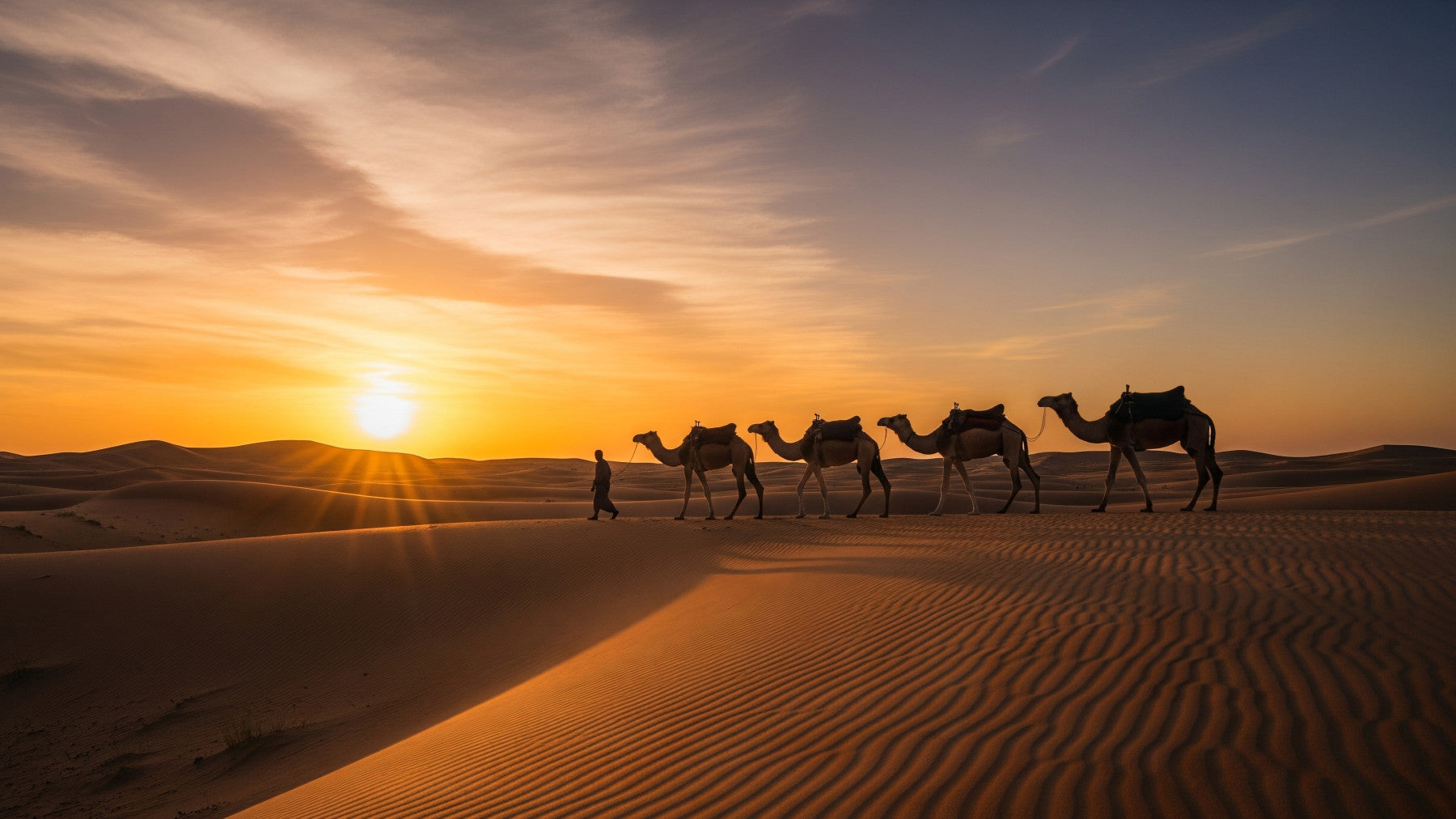Desert caravan at sunset, peaceful and calm