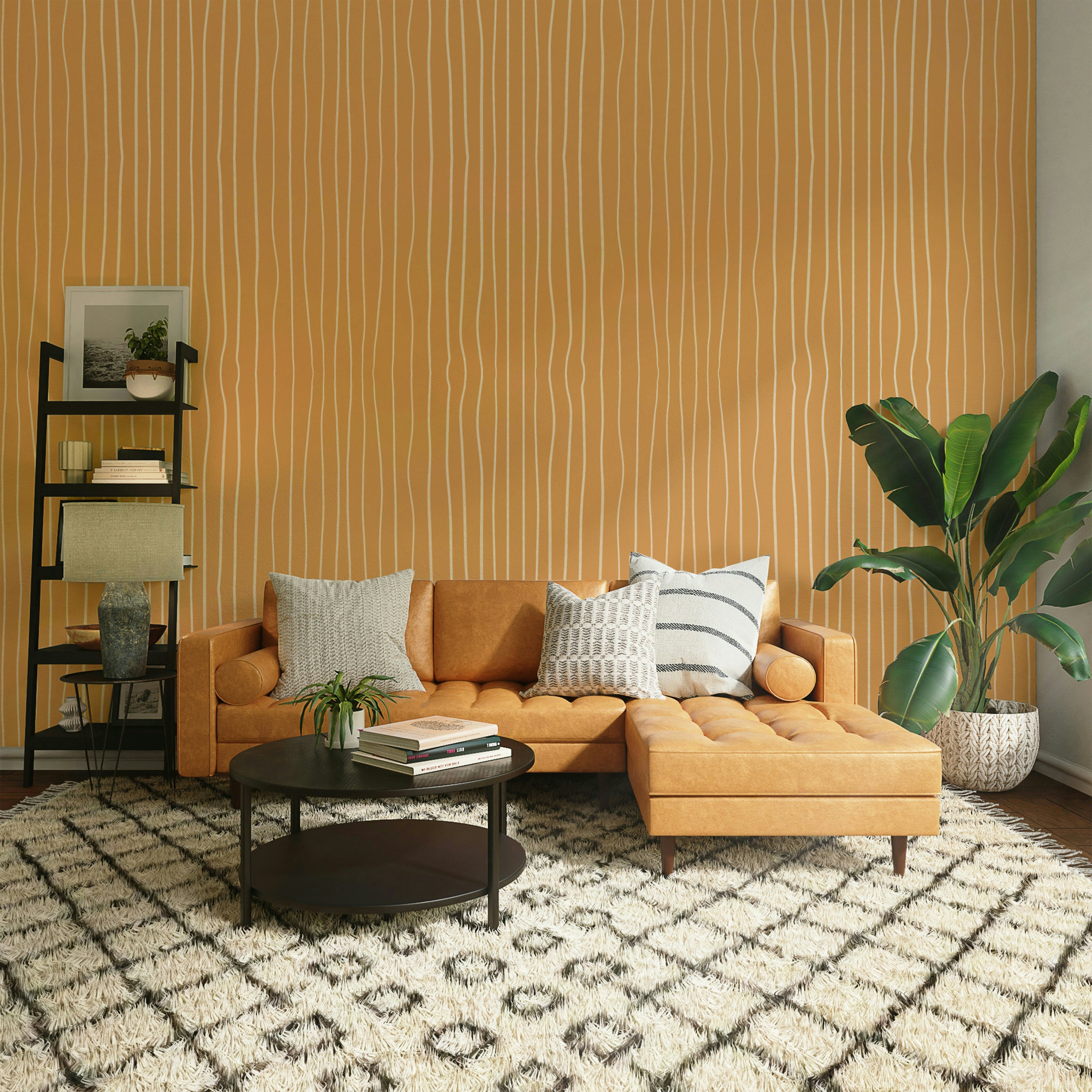 Evoking the tranquil beauty of a desert landscape at sunset, this wallpaper features a captivating pattern of vertical lines in warm beige and earthy brown. The slightly irregular lines mimic the gentle undulations of sand dunes, creating a sense of calm and serenity. Its minimalist design makes it a versatile choice for any room, adding a touch of understated elegance and natural warmth to your space. The harmonious color palette promotes relaxation and a feeling of peaceful escape, perfect for creating a serene atmosphere in your home or office.