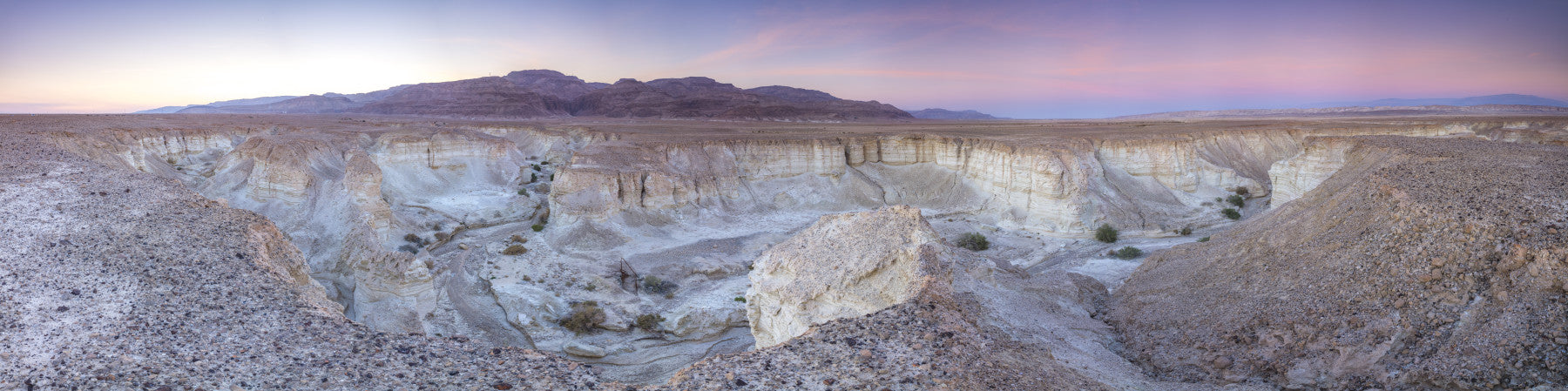 Negev Desert, Israel. Elevate your decor with this grand view of a desert valley. The high vantage point reveals vast canyons and distant mountains under a fading twilight sky. The color palette centers around earthy browns, beiges, and delicate pinks. It's suited for a living room or bedroom. Use wallpaper for walls that evoke a sense of openness. This design enhances interiors with natural textures and provides a relaxing atmosphere. Ideal for spaces needing a touch of tranquility and a connection to nature.