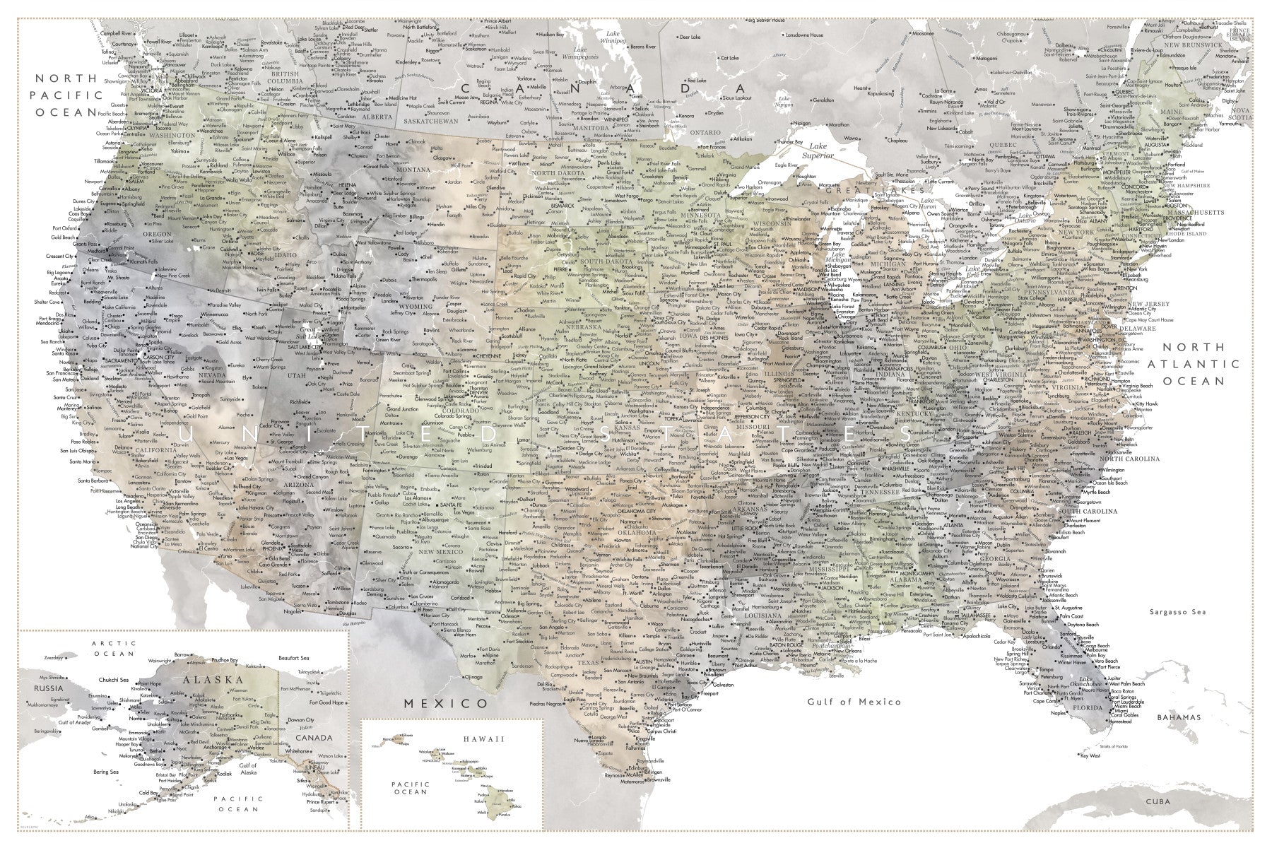 Detailed map of the USA with cities in muted watercolor, HABIKI