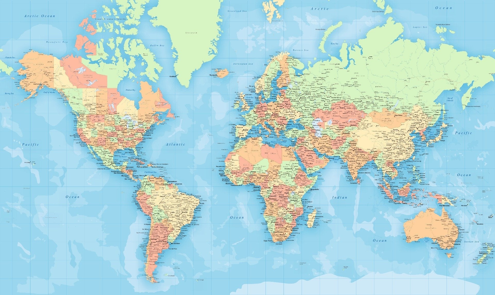 Detailed world map wallpaper mural in bright, cheerful hues.