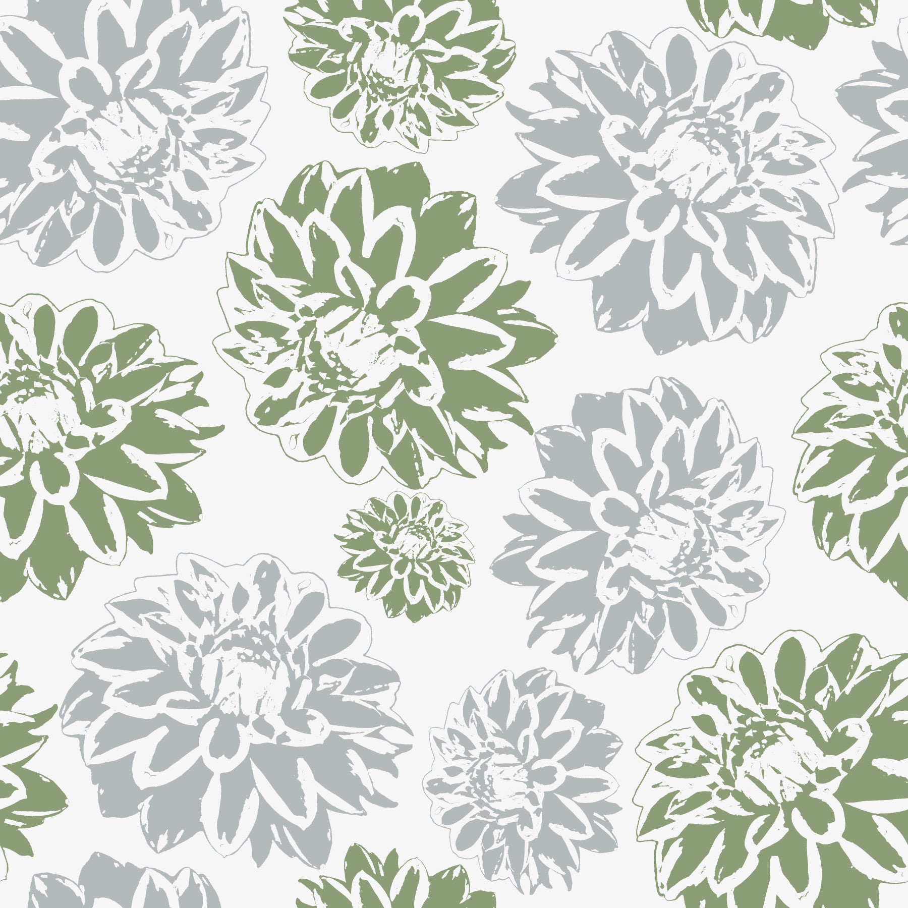 This wallpaper is a Dahlias green and blue design, a unique repeating pattern with a modern, artistic style. It's a great wallpaper for walls for a living room, bedroom, or any space that needs a fresh feel. The design features stylized dahlia flowers in shades of green and gray-blue, set against a light background. Made from high-quality, durable material, this wallpaper is a simple and quick way to refresh your home decor with a one-of-a-kind look.
