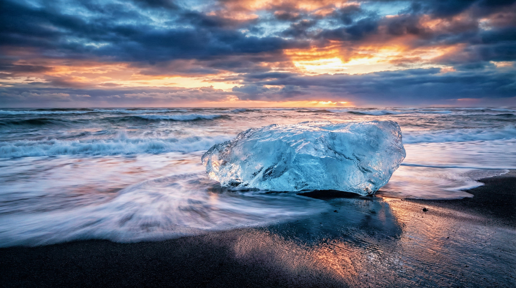 Transform your living space with this serene landscape. The dramatic sky and icy textures bring the raw beauty of Iceland's Diamond Beach directly to your walls. Observe how the sunrise casts warm hues on the ice, providing both a tranquil mood and a conversation piece. This unique wallpaper for walls provides a contemporary, upscale look, fitting for living rooms, bedrooms, or even a home office. Its sophisticated color palette complements neutral or minimalist interiors, enhancing the room with a sense of expansiveness. This wallpaper makes any room a peaceful retreat.