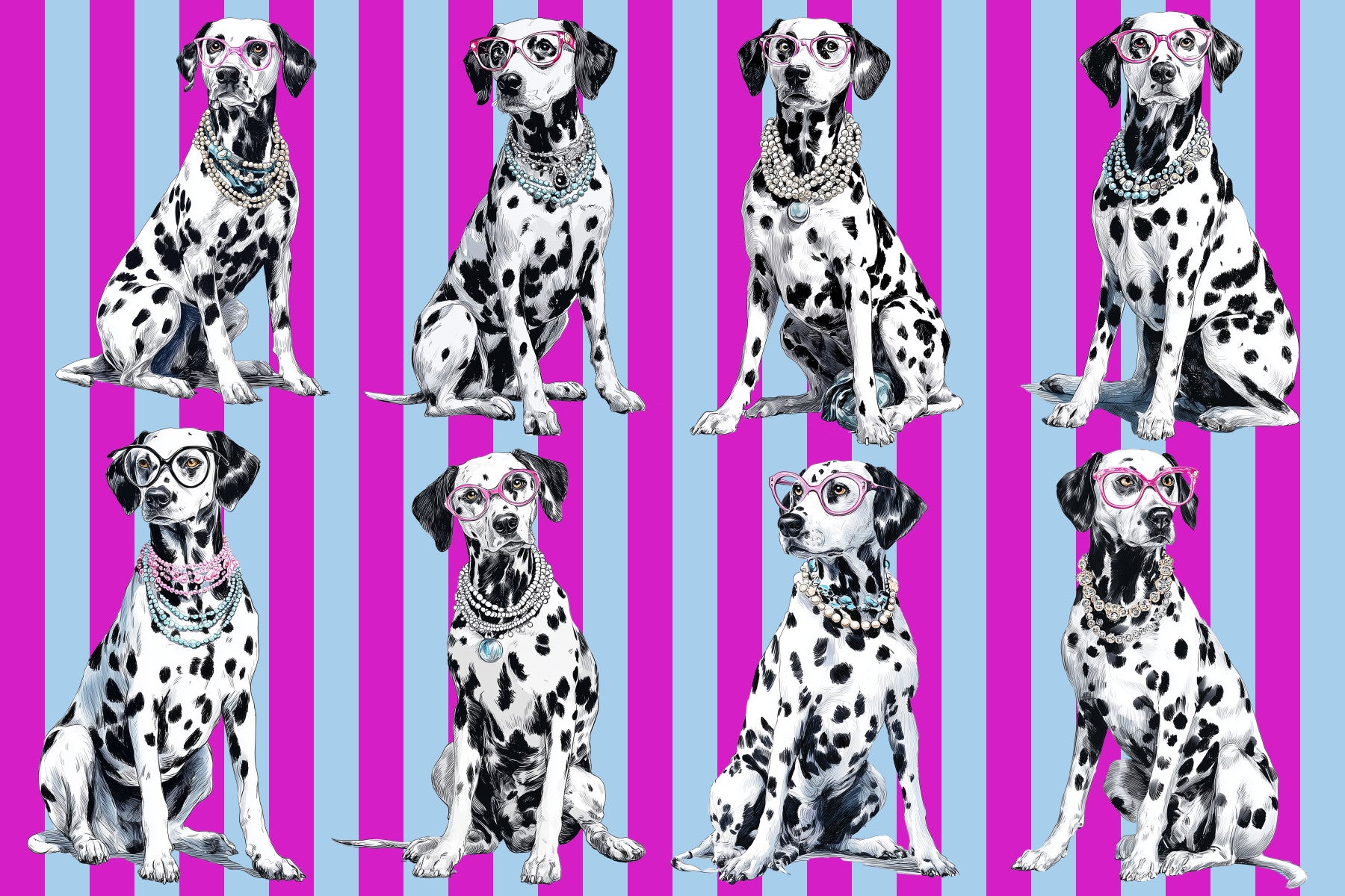 Step into a world of canine couture with "Diamond Dalmata"! This wallpaper is a playful parade of dapper Dalmatians, each sporting a unique, eye-catching pair of glasses and adorned with strings of glistening pearls. Imagine a high-fashion photoshoot, but with irresistibly charming dogs as the stars. The bold, vertical stripes in shades of vibrant magenta and soft blue create a dynamic backdrop that pops, perfectly complementing the dogs' iconic spots and dazzling accessories. More than just a design, "Diamond Dalmata" is a statement – a celebration of quirky elegance and a touch of whimsical luxury. Unleash your inner trendsetter and let these glamorous pups add a spark of joy and sophistication to your space. Perfect for pet lovers, fashion enthusiasts, or anyone seeking a dash of unforgettable style.