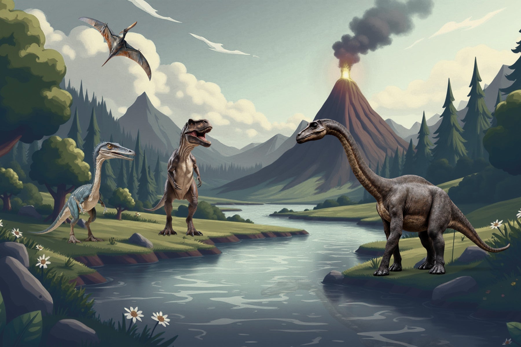 Bring ancient wonder to your walls with this captivating dinosaur landscape. Dinosaurs roam a lush valley, complete with a towering volcano in the distance. This wallpaper for walls offers a blend of adventure and nature, creating an inviting space. Consider using it in a kid's room or playroom. The muted color palette works well in a bedroom or living room, creating a calm and fun atmosphere. The cool tones invite a serene feeling to your interiors.