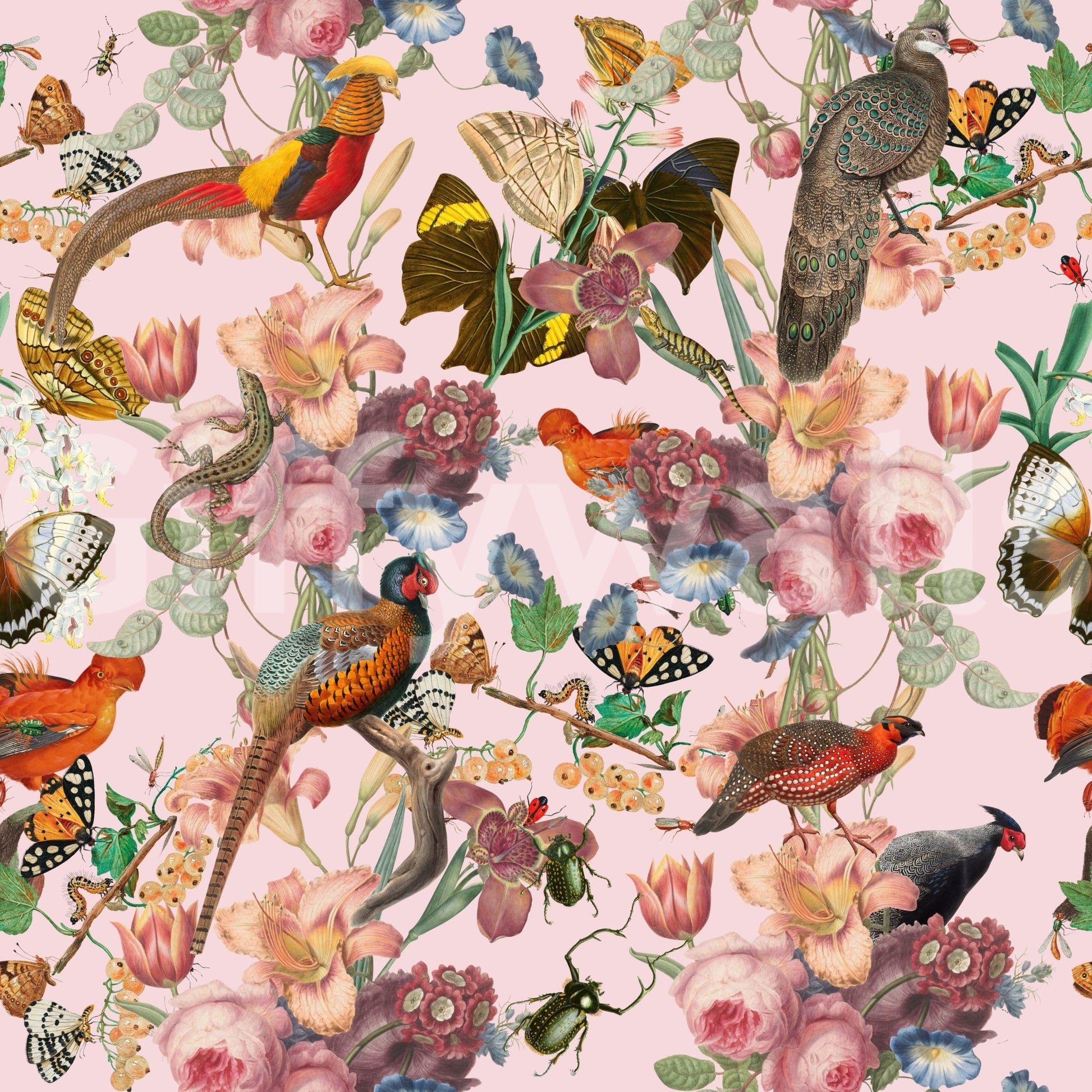 Indulge in the vibrant tapestry of 'Divertirs,' a wallpaper design that celebrates the whimsical beauty of nature's intricate details. A symphony of richly colored flowers – roses, lilies, and tulips – intertwine with exotic birds, including resplendent pheasants and a peacock-like species, creating a lively scene. Butterflies with delicate wings flutter alongside busy beetles and graceful lizards, adding a touch of playful dynamism. The soft blush pink background enhances the overall elegance and creates a serene yet captivating atmosphere, perfect for adding a touch of sophisticated charm to any space. This artistic blend of flora and fauna offers a delightful escape and a vibrant visual treat.