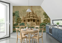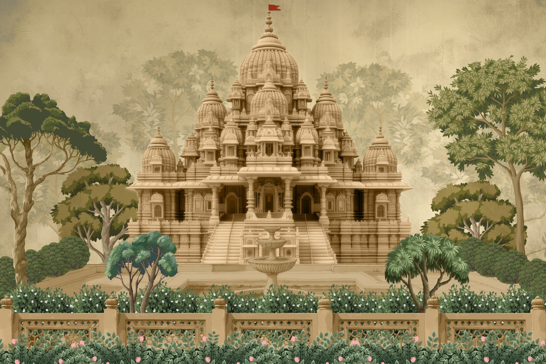 Immerse yourself in the serene beauty of 'Divine Devalaya,' a captivating wall décor piece that evokes a sense of peace and spiritual harmony. This design features a majestic temple, a testament to intricate architecture and divine artistry. The temple's grandeur is softened by the surrounding lush greenery, creating a tranquil oasis within your living space. A decorative wall lined with flowering bushes adds a touch of earthly beauty to the sacred space. The overall warm, muted tones create a soothing ambiance, perfect for creating a space of reflection and calm. Let the presence of this sacred space grace your walls, infusing your home with a sense of reverence and inner peace. Transform any room into a sanctuary with this evocative representation of a place of worship.