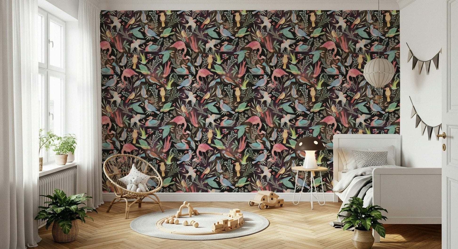 Embark on a nocturnal avian adventure with "Dream Dark Birdwatcher's." This captivating wallpaper showcases a vibrant tapestry of exotic birds—flamingos, hummingbirds, and ducks—rendered in a dreamy, watercolor style against a rich, dark background. Intricate floral details intertwine with the feathered creatures, creating a surreal and enchanting scene. The colors are both bold and muted, offering a unique blend of fantasy and elegance. Perfect for adding a touch of whimsical mystery to any digital device.