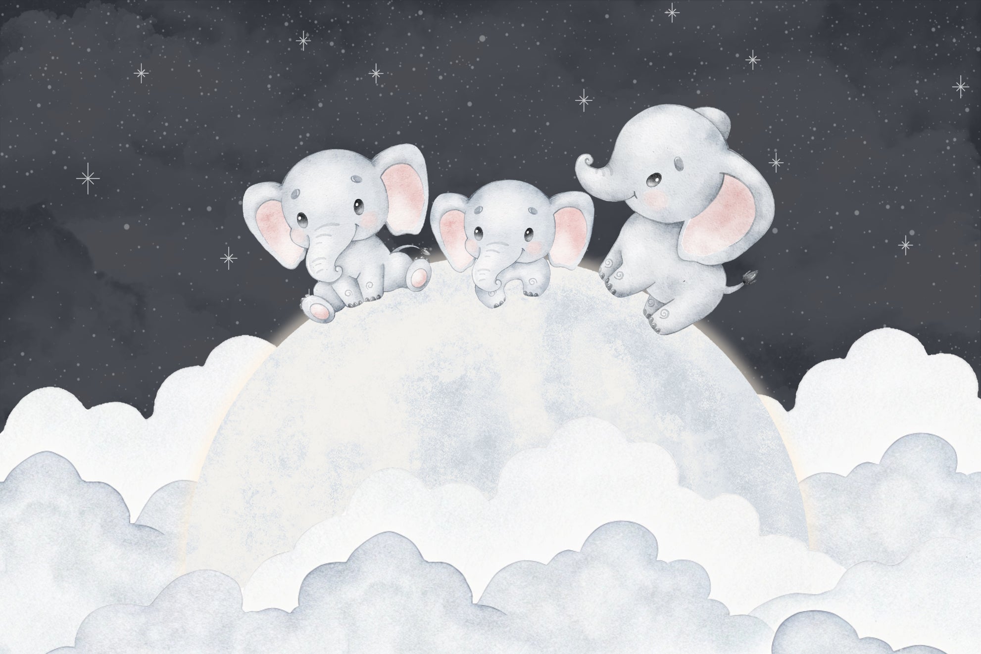 Create a serene and playful atmosphere with our Dreamy Baby Elephant Wallpaper. Featuring three adorable baby elephants sitting on a glowing moon, surrounded by fluffy clouds and twinkling stars, this design brings warmth and charm to any child's room. Perfect as elephant wallpaper for nurseries, playrooms, or toddler bedrooms, the soft pastel hues of gray and blush pink create a calming environment for restful sleep and imaginative play. Crafted from high-quality, child-safe materials, this wallpaper is durable and easy to maintain. It is an ideal choice for parents looking to create a cozy, enchanting space for their little ones.