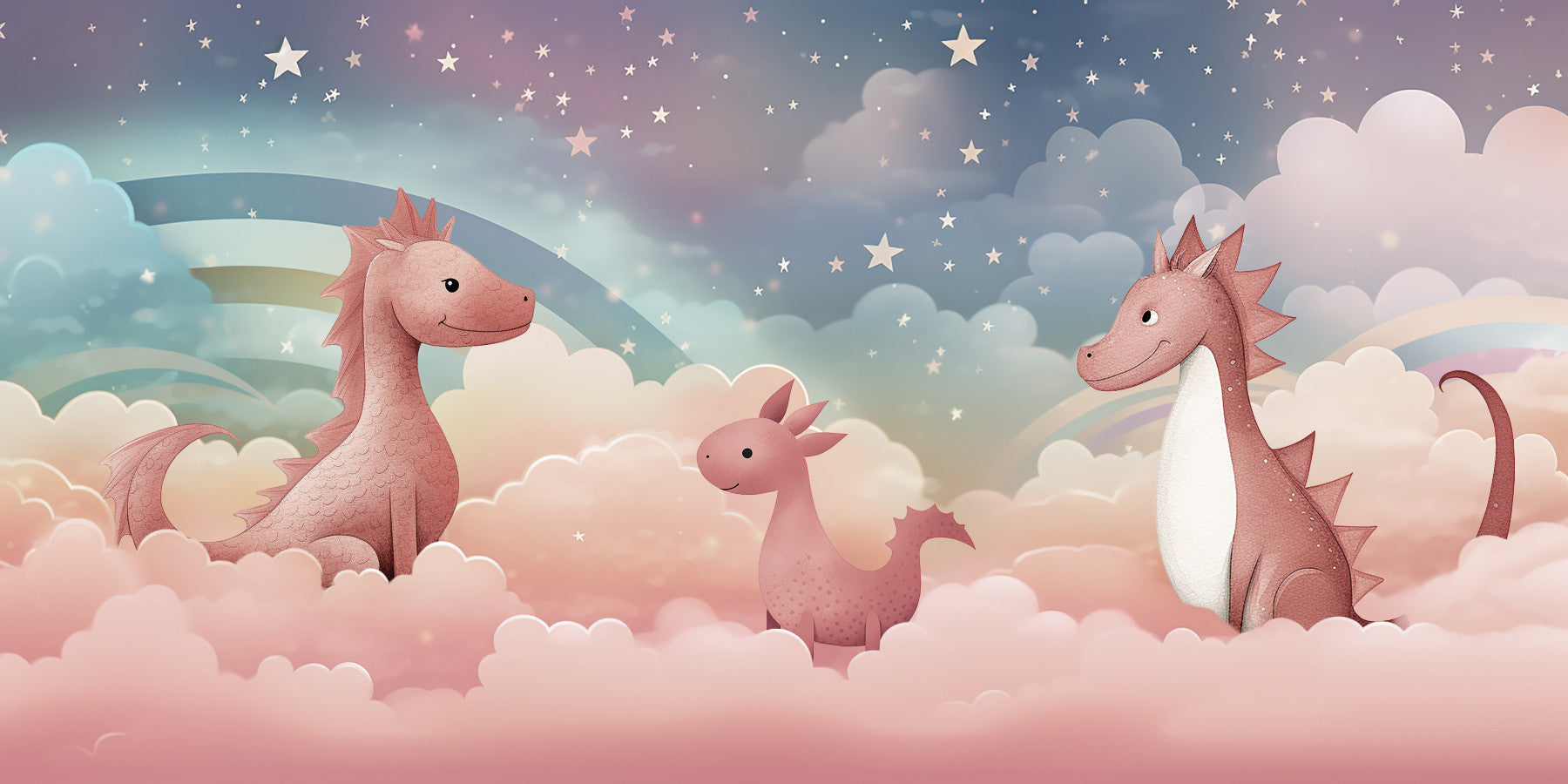 Float away on a dreamy cloudscape with this whimsical wallpaper for walls. Gentle dragon characters add a touch of fantasy against a soft, pastel backdrop of clouds, rainbows and stars. Its soft hues of pink, blue, and lavender bring a calming feel, perfect for a nursery or child's bedroom. The playful design creates a cozy atmosphere, while the starry details spark imagination and joy. Elevate a kids' room with this cute and inspiring image.