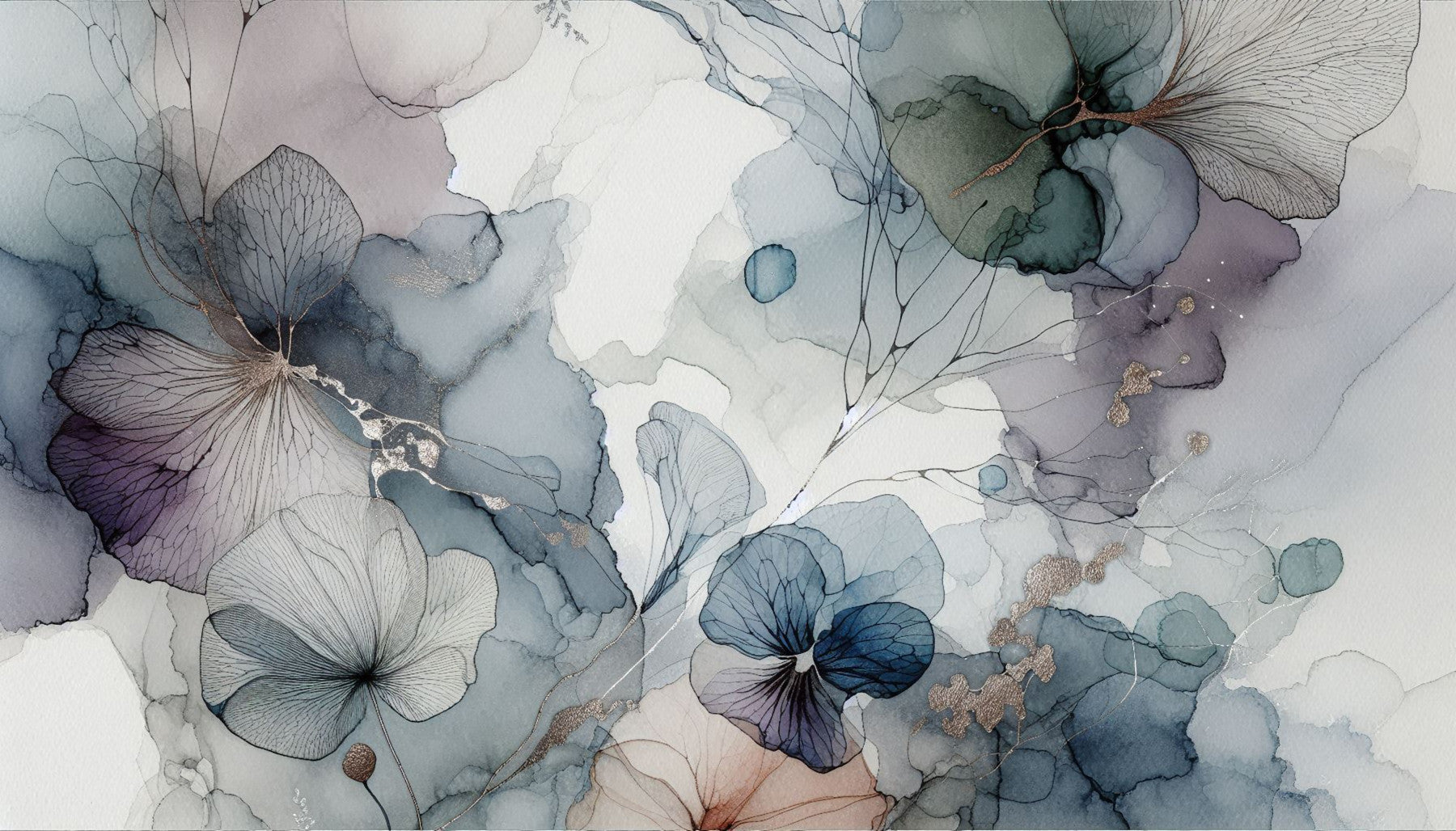 This ethereal wallpaper captures the delicate beauty of abstract floral forms rendered in a captivating blend of soft blues, grays, and hints of rose gold. The watercolor-like effect creates a dreamy, tranquil atmosphere, perfect for spaces seeking a sense of calm and sophistication. Intricate linework details within the translucent petals add depth and intrigue, while the fluid movement of color suggests a gentle breeze. The overall effect is one of peaceful elegance, ideal for bedrooms, living rooms, or any space where serenity is desired. The subtle shimmer of gold accents adds a touch of luxury without overpowering the soft palette.