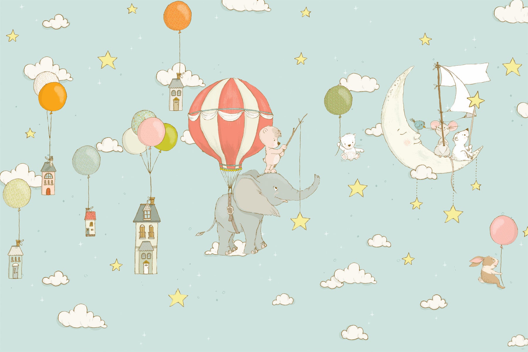 Float away with this dreamy wallpaper for walls! Delicate illustrations show animals soaring through a pastel sky filled with stars, clouds, and houses on balloons. Soft shades of blue, pink, and yellow create a calming effect. It's ideal for a nursery or kids' room. The whimsical design brings a touch of magic and complements any cozy interior.