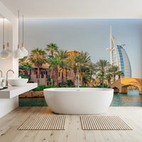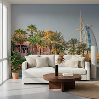 Invite a sense of serenity into your space with this captivating wallpaper for walls. Featuring iconic architecture framed by lush palm trees and tranquil waters, this design brings the essence of a luxury escape directly into your home. The serene color palette, dominated by soft blues, greens, and warm beige tones, creates a relaxing atmosphere. Ideal for living rooms, bedrooms, or even home offices, this wallpaper adds depth and interest, making any room feel more spacious and inviting. Elevate your interior design with this stunning scene.