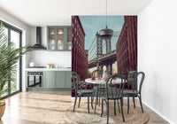 Manhattan Bridge seen from the Dumbo neighborhood in Brooklyn, New York. Capture the iconic charm of Brooklyn with this city wallpaper. Featuring the Manhattan Bridge framed by classic brick buildings and a tranquil sky, it adds an urban edge to any space. The sepia-toned palette brings warmth and works beautifully in a living room, office, or bedroom. Use this wallpaper for walls to create a stunning feature wall. The design creates depth and character, lending a metropolitan vibe to interiors. It complements both modern and industrial decors and helps create an exciting focal point.