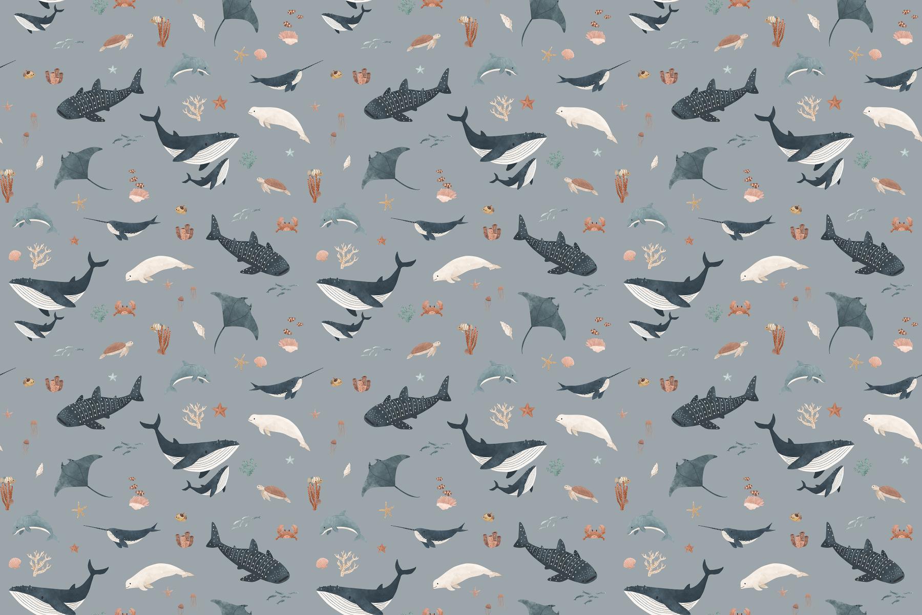 Transform your space into an underwater paradise with this Dusty Blue Ocean Giants Marine Wallpaper, featuring majestic whales, sharks, stingrays, and dolphins swimming among coral reefs. The muted dusty blue background adds a calming coastal charm, making it an ideal choice for nurseries, children's rooms, or ocean-inspired interiors. Designed with intricate watercolor details, this marine wallpaper brings the wonders of the deep sea to your walls. Printed on high-quality, easy-to-apply material, it ensures durability and a flawless finish. Perfect for ocean lovers, this aquatic wallpaper creates a serene and adventurous marine retreat.