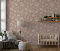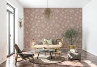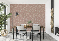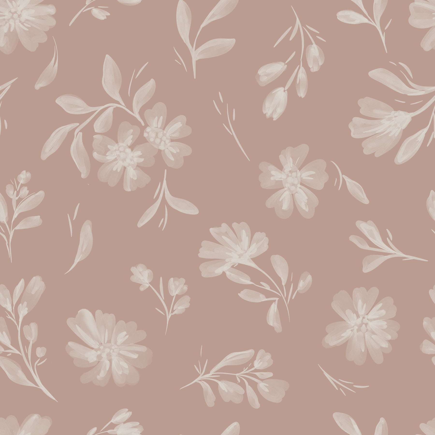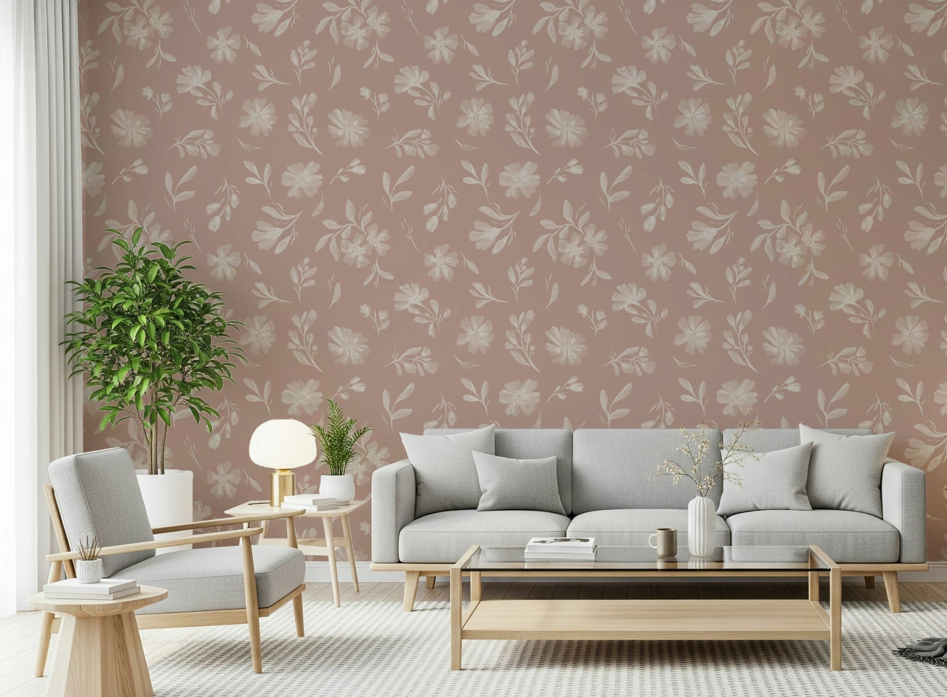 Embrace the subtle charm of this floral pattern. Soft ivory flowers and leaves dance across a dusty rose backdrop, crafting a gentle, inviting atmosphere. The understated brushstrokes add a handcrafted feel to this design. This wallpaper for walls delivers a peaceful, elegant vibe to bedrooms, living rooms, or nurseries. It complements minimalist interiors, Scandinavian decor, and provides a touch of organic sophistication.