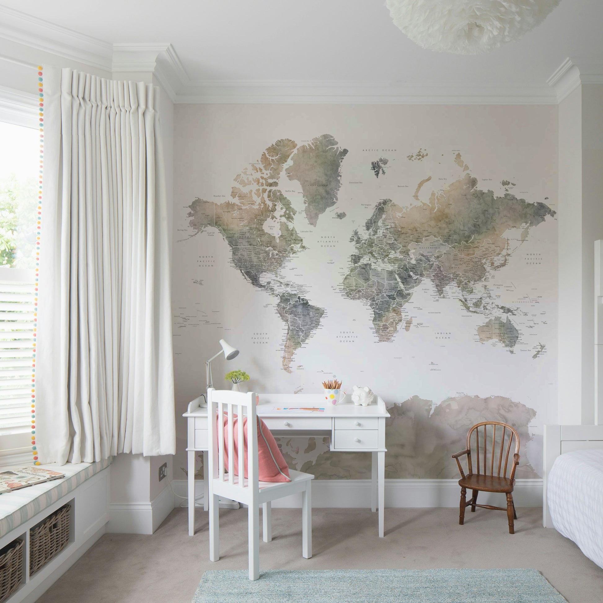 Bring natural warmth and timeless elegance to your space with the Earth Tones Watercolor World Map Wallpaper. Featuring a soothing blend of taupe, sage green, beige, and muted gray, this mural captures the beauty of the world through a grounded, organic palette. Each country and city is clearly labeled, offering both decorative charm and educational value. Ideal for living rooms, studies, offices, or eco-inspired interiors, it complements rustic, minimalist, and boho styles. Available in peel-and-stick or traditional wallpaper formats, it’s easy to install and eco-friendly. Let your walls reflect the calm and balance of nature with this earthy world map.