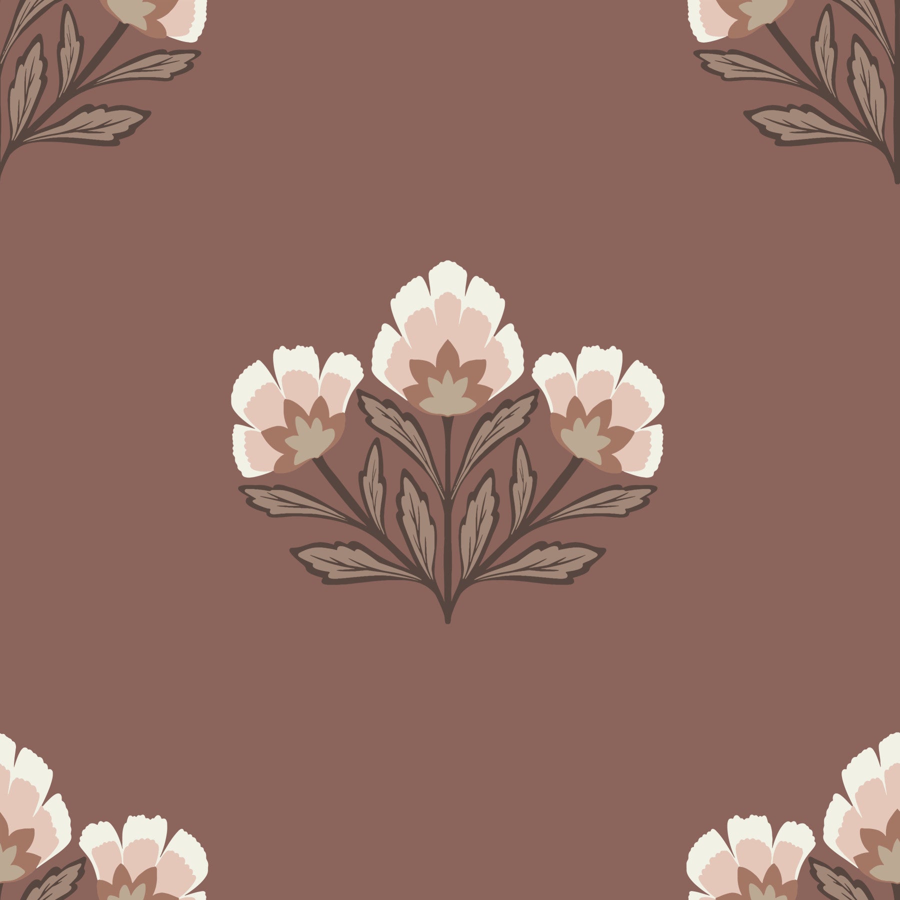 This elegant floral design features stylized blossoms in a soothing palette of earth tones. The repeated pattern makes it ideal for creating a comforting atmosphere. Use this wallpaper for walls to enhance bedrooms, living rooms, or hallways with a subtle nod to nature. Its clean lines and muted colors work well with both modern and traditional interiors, providing a sophisticated backdrop without overwhelming your décor. Transform any space into a sanctuary of calm with this seamless, floral pattern.