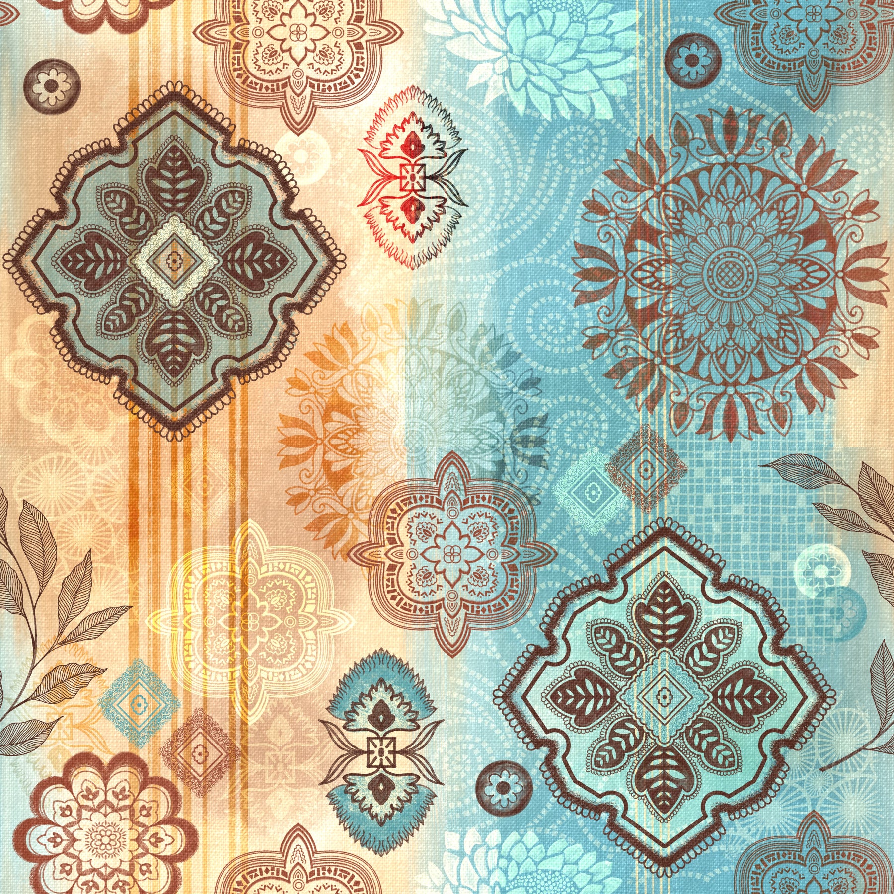 Adorn your walls with this chic boho design. This wallpaper's seamless structure has intricate patterns and botanical elements in tones of beige, brown, turquoise, and red, giving it a sense of nature. Ideal for living rooms, bedrooms, or studies, it presents a relaxing backdrop. As wallpaper for walls, it integrates a warm aesthetic, elevating interiors with a classic yet organic vibe.