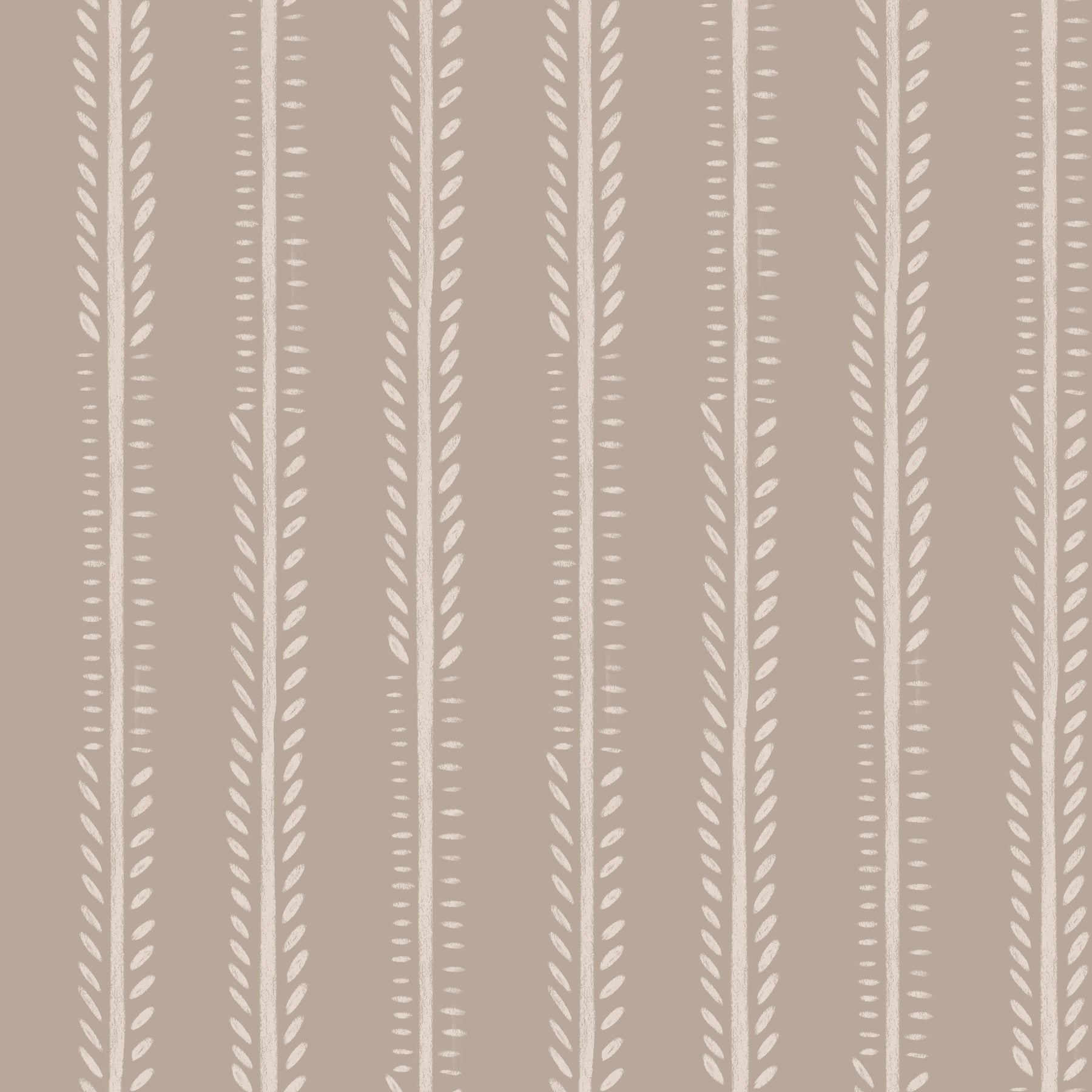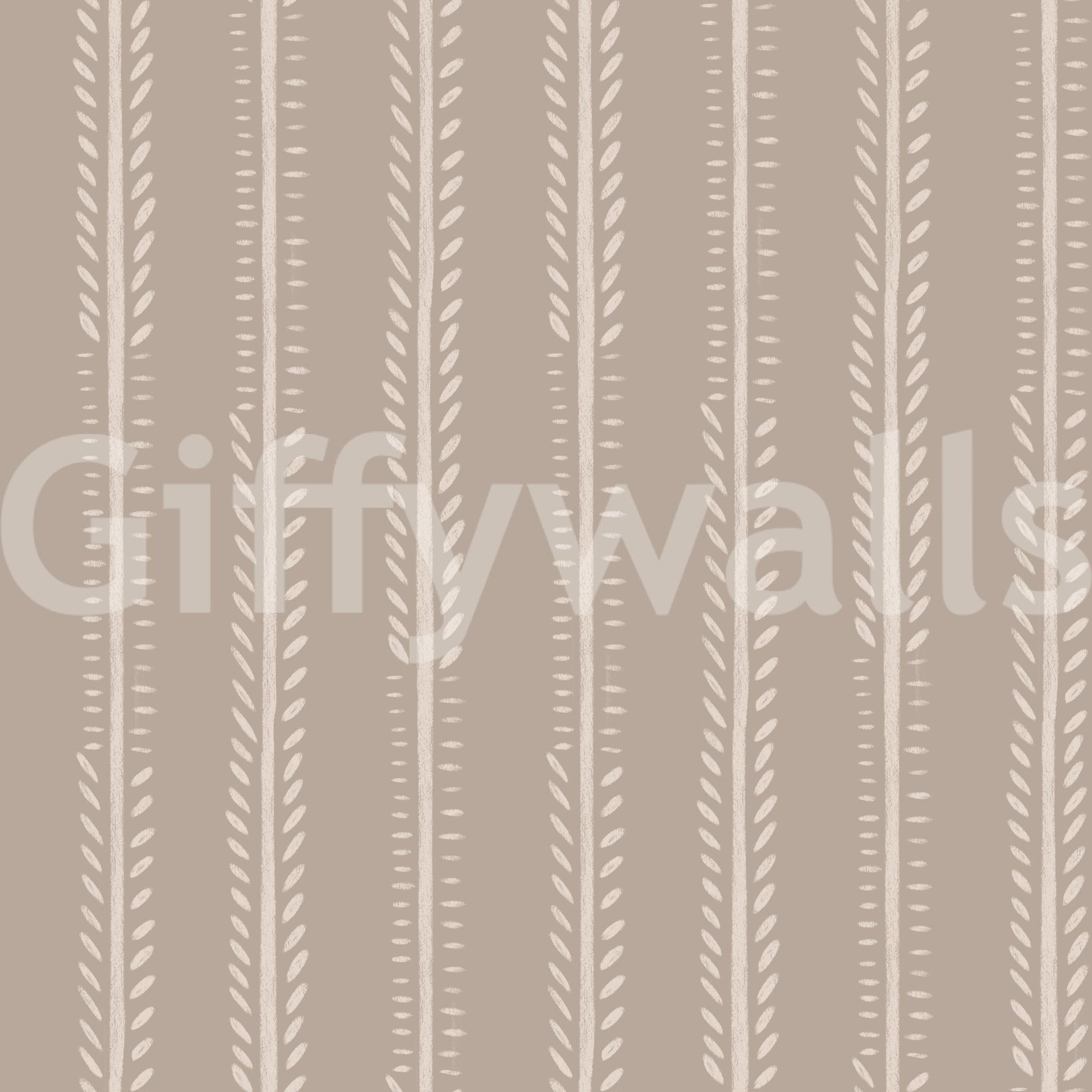 Embrace natural serenity with this wallpaper. Vertical stripes in a muted taupe are delicately accented by a repeating pattern of hand-drawn, leaf-like shapes in a creamy off-white. The subtle textural elements give the design a handcrafted feel, contributing to its calm and peaceful atmosphere. The color palette is perfectly suited to those seeking a tranquil, earthy vibe. Perfect for creating a soothing space in bedrooms, living rooms, or home offices. The timeless aesthetic seamlessly blends with diverse interior styles.