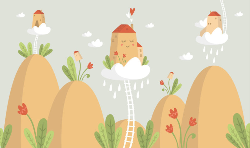 This delightful wallpaper mural for the walls of a room in a mountain cottage is made up of cute houses on top of fluffy brown hills, friendly birds, and colorful red flowers that provide some color to the peaceful scene. The soft white clouds, with soft tiny rainwater drops, are caring for the flowers below, creating a cute picture to decorate a child's room. The subtle heart details on one of the houses add a sense of warmth and love, making it an inviting environment for storytelling and restful sleep. The stairway of the cloud homes climbing up to one of the houses evokes an exciting feeling without needing to get out of the room.