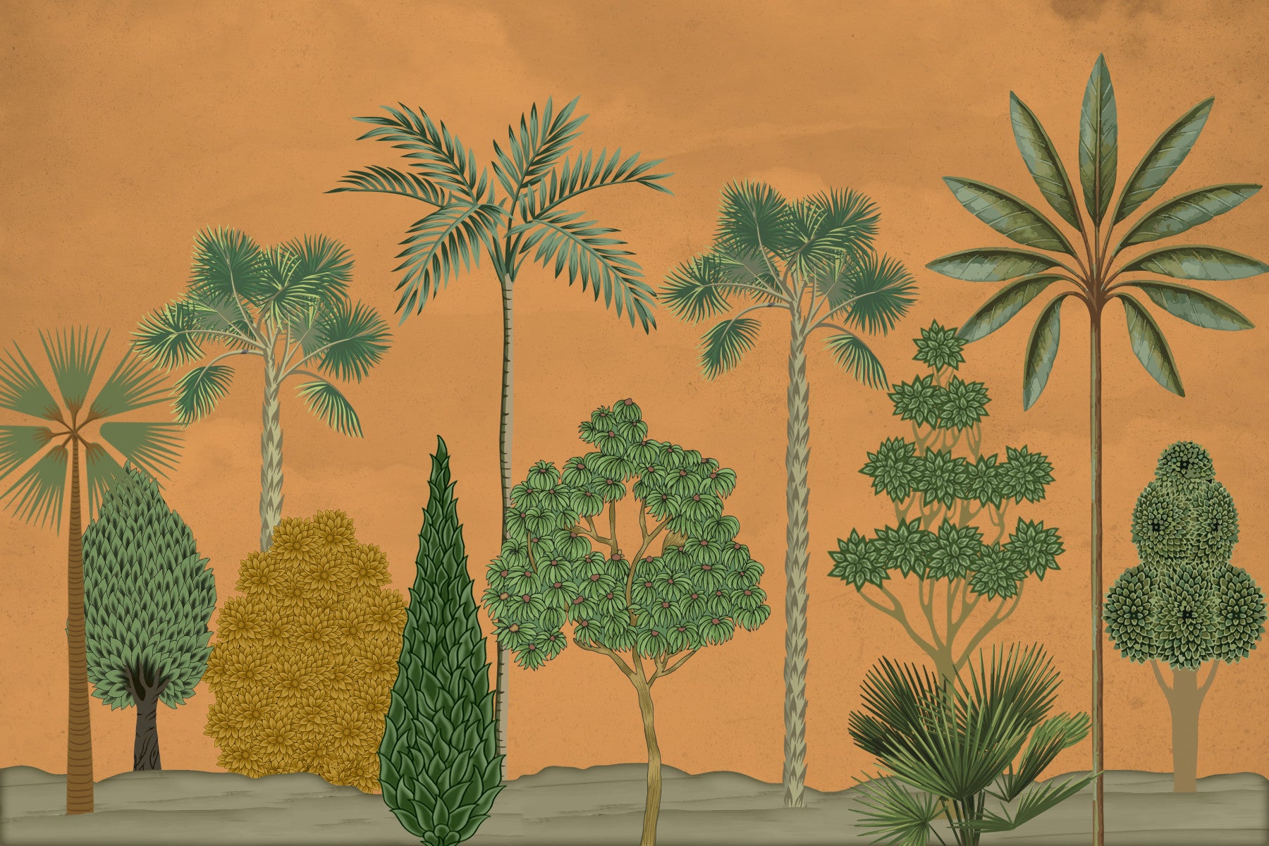Invite nature indoors with this stylized palm and tree design. Set against a warm terracotta backdrop, lush green trees create a calming scene. This wallpaper for walls is a versatile choice. Place it in your living room, bedroom, or hallway to add a touch of organic style. The neutral tones make it easy to match with various decor styles. Consider this design to brighten up neutral color schemes.