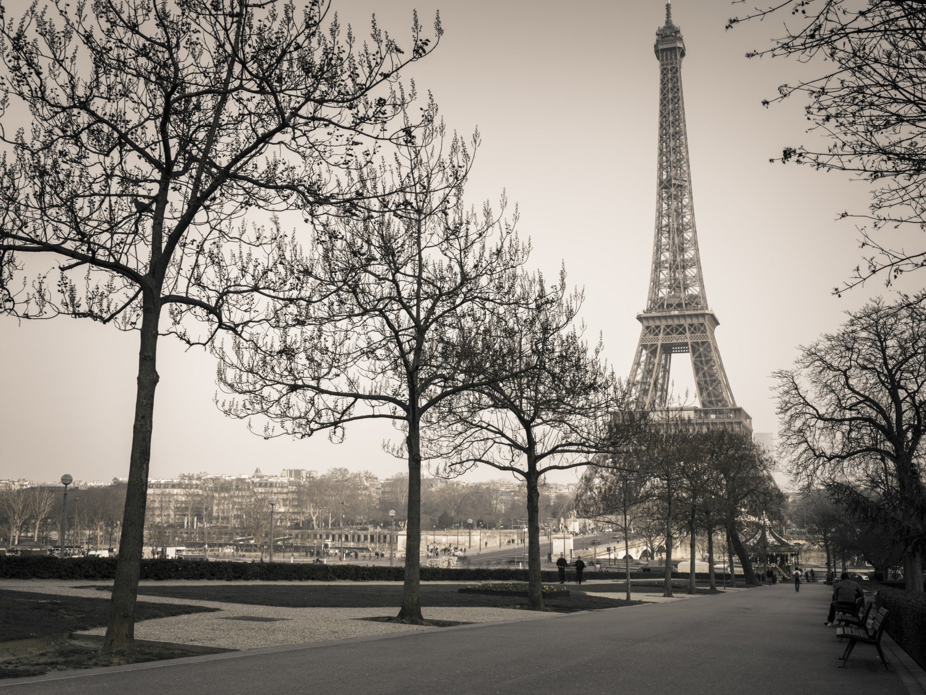 Pathway leading to Eiffel tower, Paris. Transport yourself to the heart of Paris with this exquisite sepia-toned wallpaper. The iconic Eiffel Tower stands as a testament to timeless design and romance, softened by the delicate branches of leafless trees in the foreground. The muted palette lends a sense of nostalgia and quiet sophistication, allowing the architectural details of both the tower and the surrounding city to shine. The overall effect is one of serene beauty, capturing the enduring allure of Paris and its enchanting spirit.