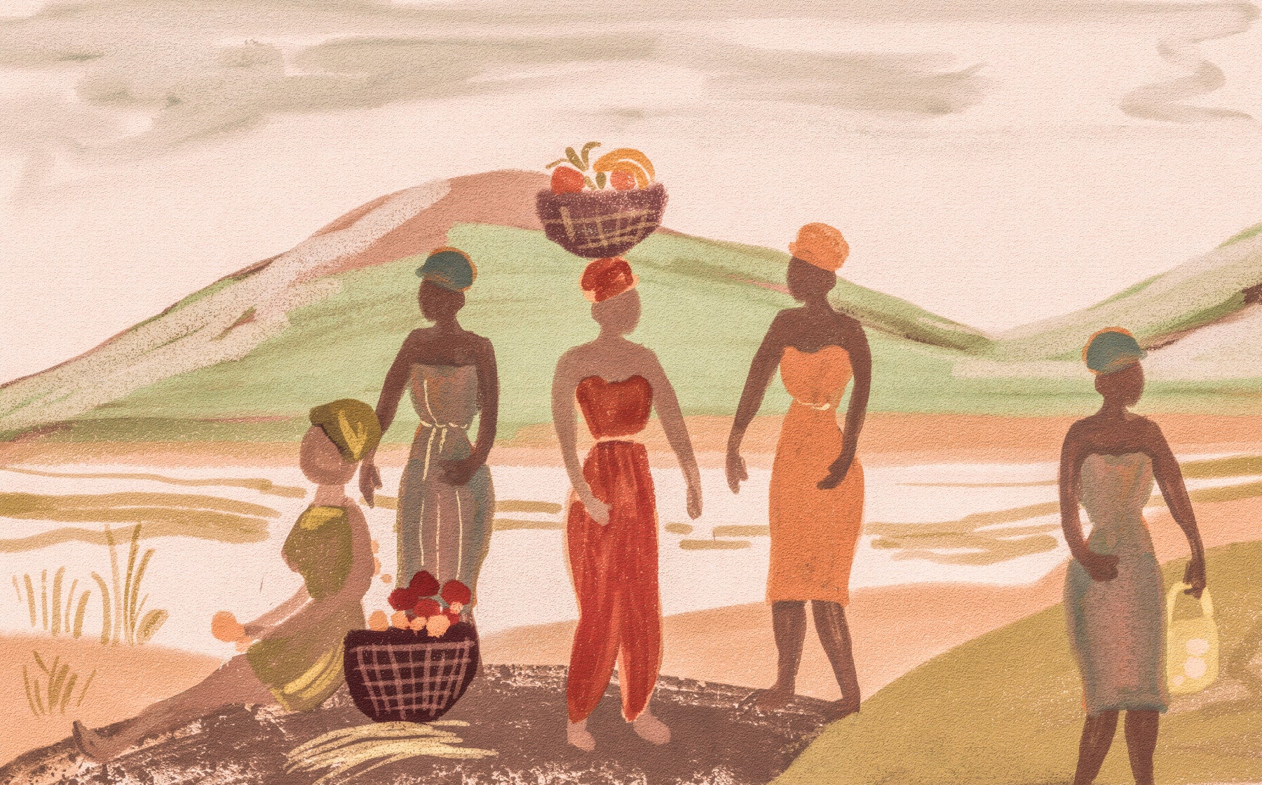 Echoes of the Motherland Graceful African Women in Vibrant Traditional Attire Bearing the Harvest of Joy Wall Mural