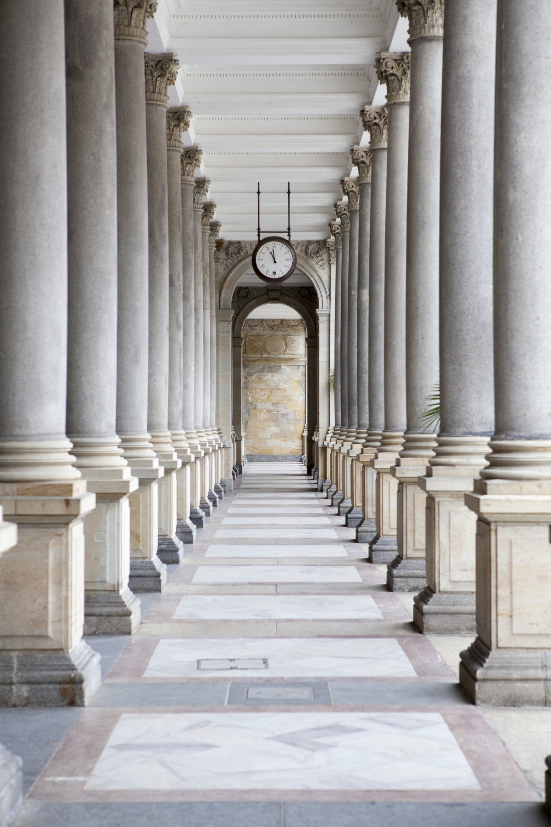 Transform your space with this striking arcade scene. The repeating pattern of gray columns creates depth, highlighted by a vintage clock, adding a sense of timeless elegance. This wallpaper for walls introduces a serene and structured vibe to any room. Ideal for hallways or living rooms, the neutral palette creates a calm setting. Bring a bit of architectural grace to your home and watch how it elevates your interiors. Let the pattern draw you in.