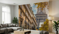 Bring Parisian charm to your home with this stunning wallpaper for walls. It captures the Eiffel Tower bathed in golden sunlight, framed by classic Parisian architecture and autumn foliage. The warm, inviting color palette creates a sophisticated atmosphere, perfect for living rooms, dining rooms, or hallways. This design adds a touch of European elegance and architectural interest to any room. Transform your space with the timeless beauty of Paris.