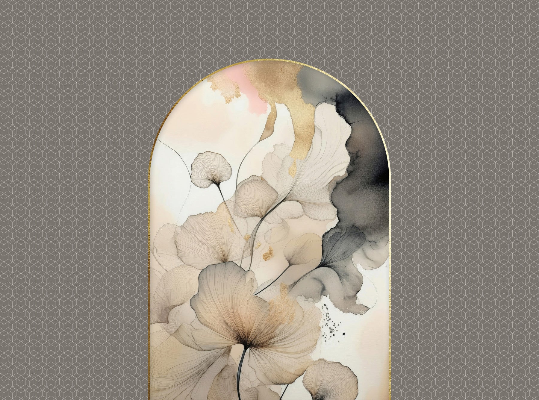 The stylized, artistic flow of the Gingko Archway wallpaper mural.