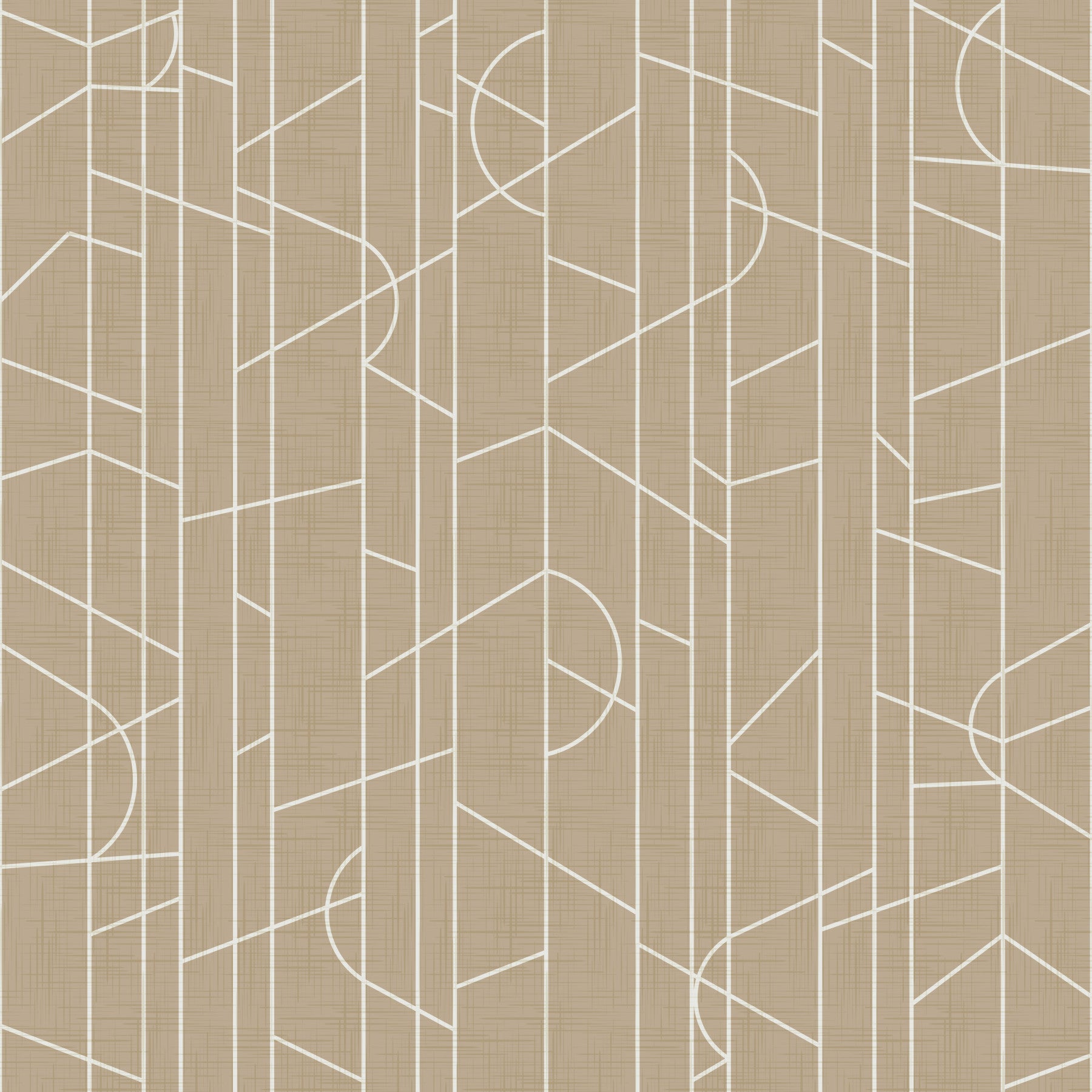 This sophisticated wallpaper, titled "Elegant Lines Decor Safari Canvas," boasts a captivating interplay of clean, geometric lines and a subtly textured, earthy beige background. The design features a repeating pattern of intersecting lines forming triangles and partial circles, creating a sense of understated elegance and modern minimalism. The off-white lines stand out crisply against the textured backdrop, resembling a refined linen or canvas weave, evoking a feeling of natural luxury. This wallpaper seamlessly blends contemporary geometric design with a touch of rustic charm, perfect for adding a touch of sophistication to any space.