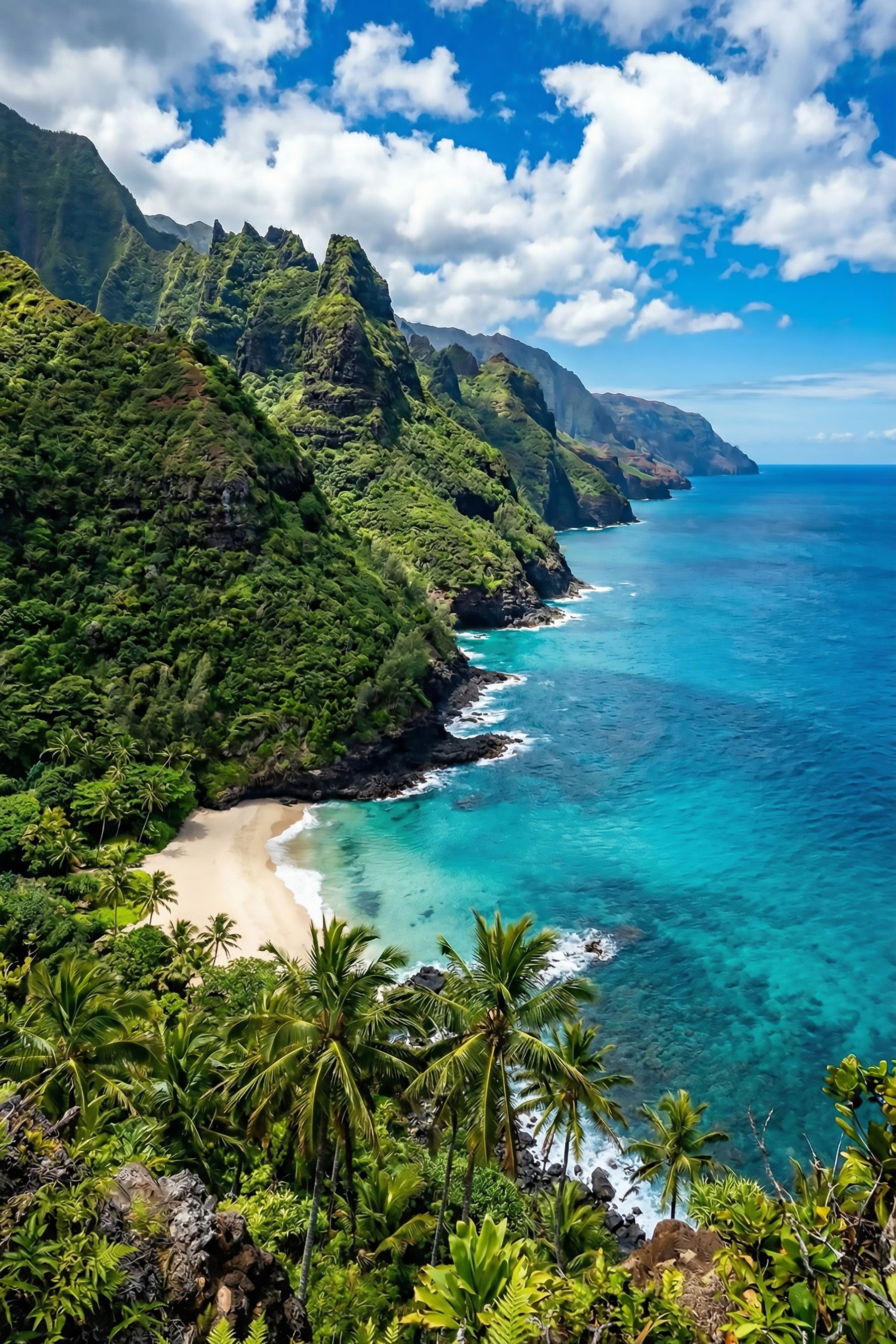 Transform your living space with this breathtaking wallpaper for walls, capturing the dramatic grandeur of a tropical coastline. Lush emerald cliffs cascade into a pristine sandy beach, framed by swaying palm trees. The vibrant turquoise ocean gradients into a deep azure, inviting a sense of calm and expansive beauty. A dynamic blue sky adorned with soft white clouds completes this panoramic design. This captivating scenery injects a refreshing, natural essence into any room. Perfect for creating a serene focal point in a living room, adding a tranquil backdrop to a bedroom, or bringing an exotic touch to a dining area. It expands your interior, offering a continuous vista of untouched nature.