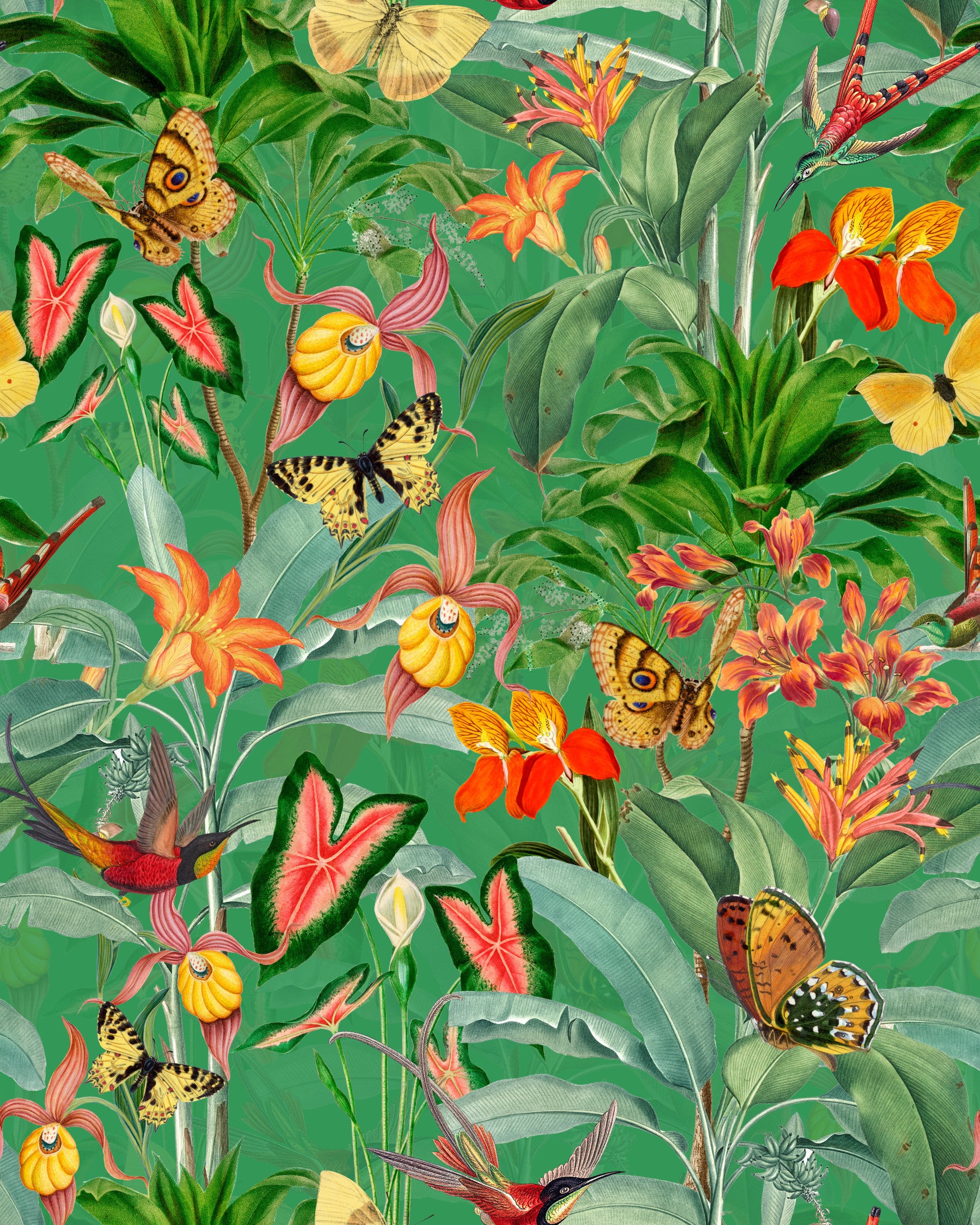 Immerse yourself in a lush paradise with this vibrant tropical botanical wallpaper. Intricate illustrations of exotic flowers, butterflies, and hummingbirds are meticulously rendered in rich jewel tones against a deep emerald green backdrop. The vintage aesthetic evokes a sense of timeless elegance, while the detailed botanical accuracy creates a captivating and realistic portrayal of nature’s beauty. This wallpaper is perfect for adding a touch of sophisticated whimsy to any space, transforming a room into a personal, verdant sanctuary.
