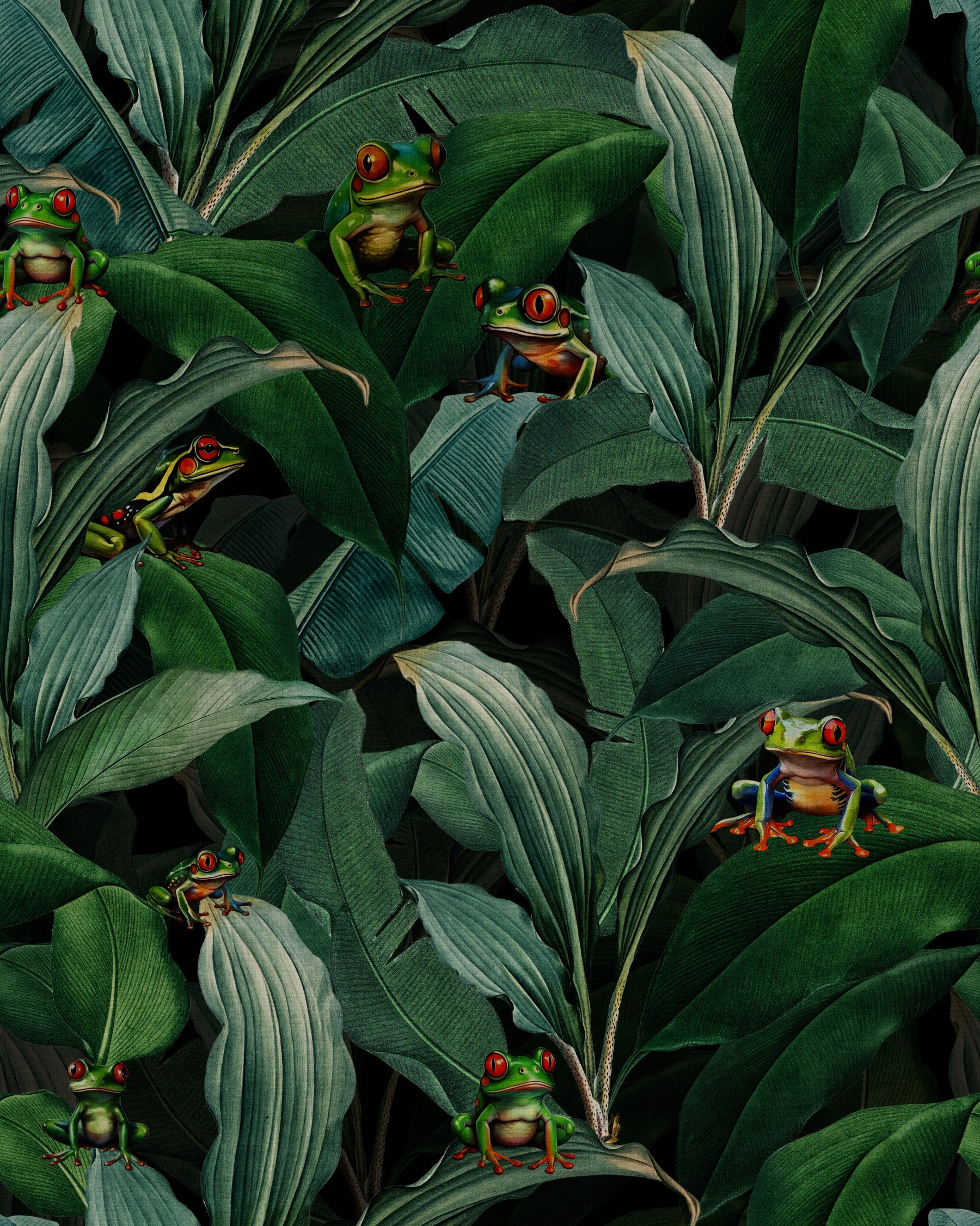 Immerse yourself in the lush depths of a vibrant rainforest with this captivating wallpaper. Intricate botanical illustrations of broad, textured leaves in varying shades of emerald green create a dense, tropical backdrop. Hidden amongst the foliage are several red-eyed tree frogs, their bright, vibrant colors contrasting beautifully against the deep greens. The overall mood is one of serene tranquility, evoking a sense of peaceful escape into nature's hidden wonders. This wallpaper is perfect for adding a touch of exotic elegance to any room, transforming your space into a personal jungle paradise.