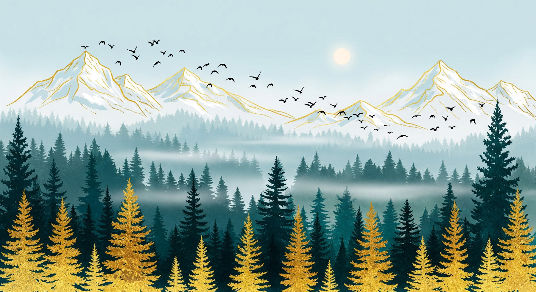 Bring the grandeur of nature indoors with this forest and mountain range image. It showcases rows of trees in shades of teal and jade. The mountain peaks feature golden outlines. A light blue sky serves as a tranquil backdrop for the birds in flight. This majestic wallpaper for walls design works in any room. It creates a sense of serenity and wonder. Consider it for a calming kid's room. Transform your living room into an enchanting getaway. Add a touch of nature to your office space.